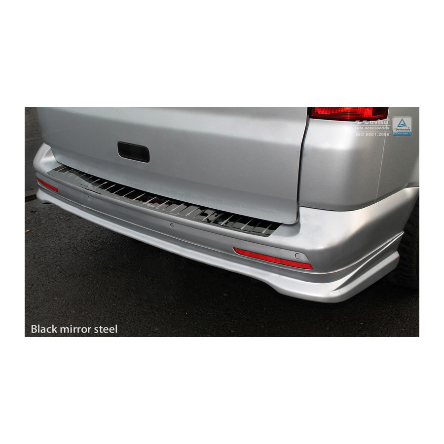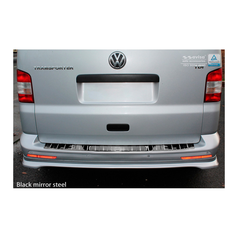 VW Transporter T5 2003-2015 (all) & T6 2015- (with rear doors) Black-Chrome Stainless steel rear bumper protector prevents damage on your car. Most cars are fitted with a rear bumper frame that is sprayed on. For example, if you load things into the car, the top of the rear bumper gets scratched quickly. The rear bumper is very sensitive to damage and the costs for repairs and refinishing are high.