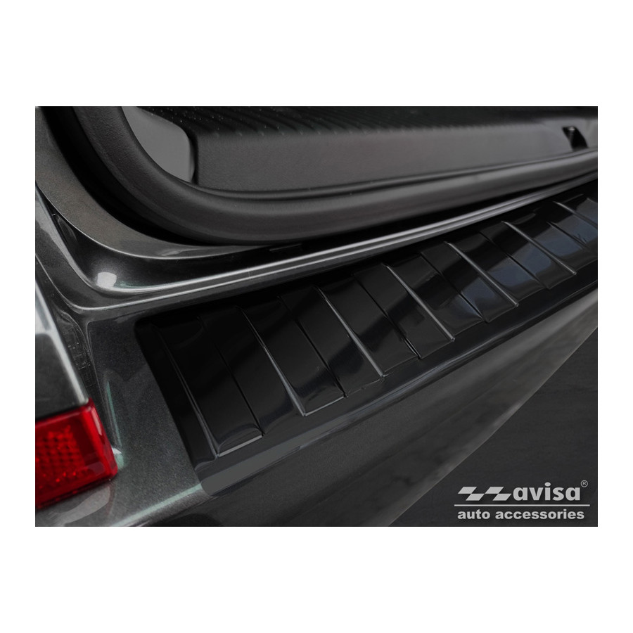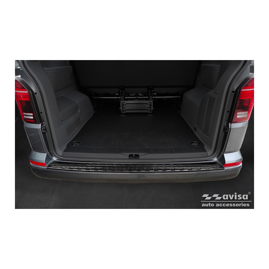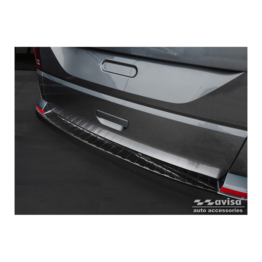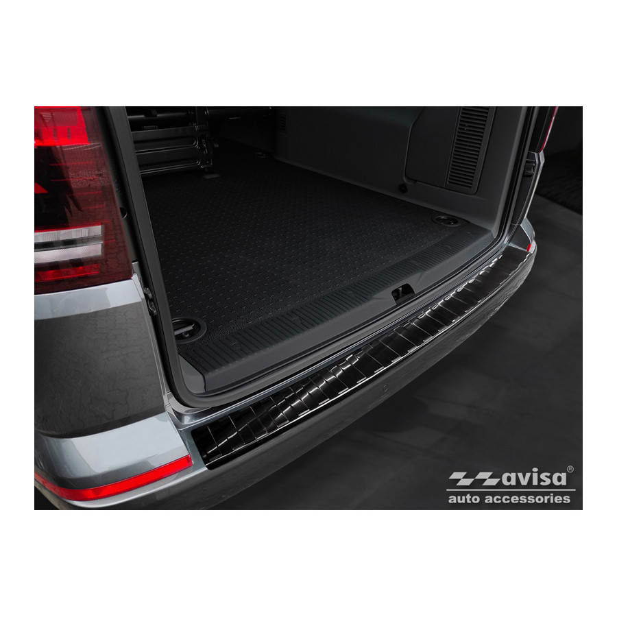 Black stainless steel rear bumper protector suitable for Volkswagen Caravelle T6 2015- & FL 2019- (with tailgate) 'Ribs'. Provide optimal protection against daily wear and tear on the top of the rear bumper. This part of the car is particularly susceptible to damage from loading and unloading. Repair and repainting costs are high, and the value of your car can decrease. With a rear bumper protector, you can prevent damage to the top of your rear bumper. These are custom-made for your car and conform to your bumper, resulting in a perfect fit. Material: Avisa's bumper protectors are made of stainless steel, which not only provides protection but also gives your car a stylish look. The material is sturdy, durable, and weatherproof, ensuring years of use. With over 30 years of experience, Avisa is a leader in the design and manufacture of these bumper protectors. They are available in various colors and styles. Installation: These bumper protectors are very easy to install. They are attached with double-sided 3M tape, which will not damage the original paint. This is included in the package, along with full schematic installation instructions. Installation takes approximately 10 minutes.