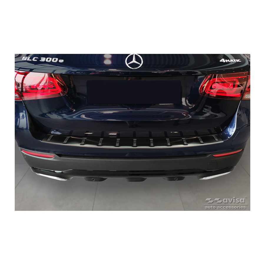 Black Stainless Steel Rear Bumper Protector Fits Mercedes GLC (X253) 2015-2019 & Facelift 2019- 'STRONG EDITION'Ensure optimal protection against daily wear and tear on the top of your rear bumper. This part of the car is very sensitive to damage from loading and unloading. Repair and respraying costs are high, and the value of your car can decrease. With a rear bumper protector, you can prevent damage to the top of your rear bumper. These are tailor-made for your car type and conform to the bumper of your car, resulting in a perfect fit.Material:The Avisa 'STRONG EDITION' protectors are made of stainless steel combined with hardened polyurethane ribs, which in addition to protection also gives your car a stylish look. The material is sturdy, durable and resistant to all weather conditions. This ensures the molding will last for years. With over 30 years of experience, Avisa is a leader in the design and production of these moldings. They are available in various colors and styles. Installation: These moldings are very easy to install. They are attached using double-sided 3M tape, which will not damage the original paint. This is included in the package, along with complete schematic installation instructions. Installation takes approximately 10 minutes. For a selection of rear bumper protectors that are attached directly to unpainted bumpers, a primer is included. The primer enhances the strength of the 3M tape.