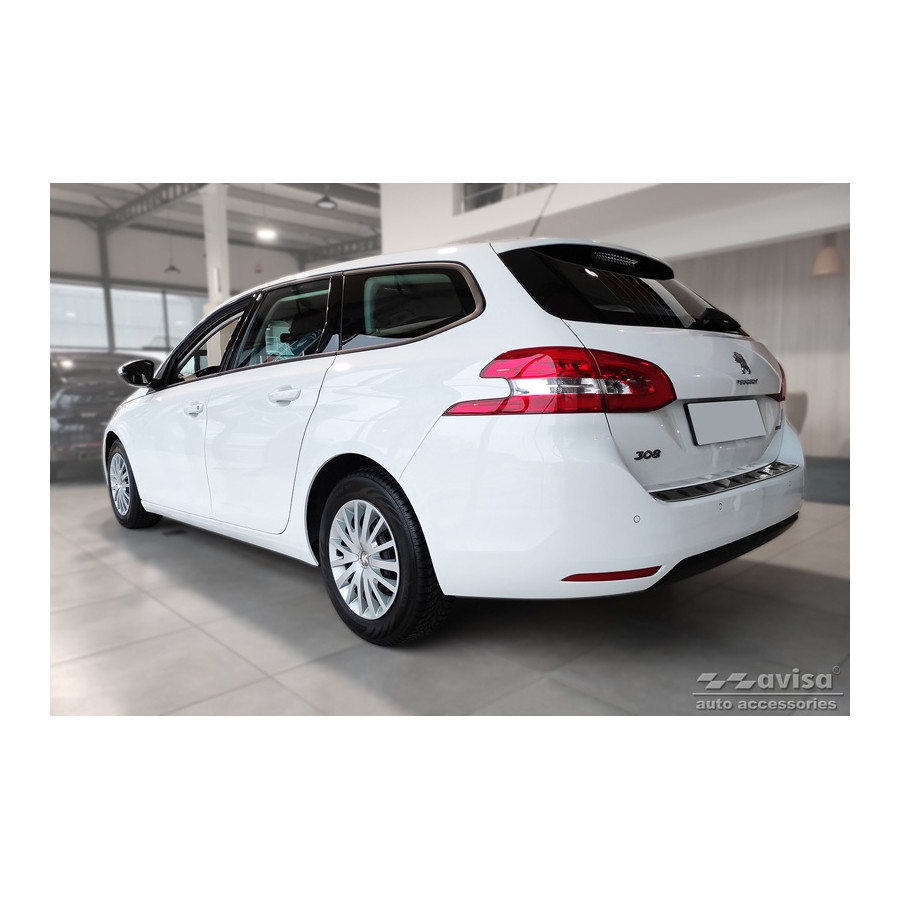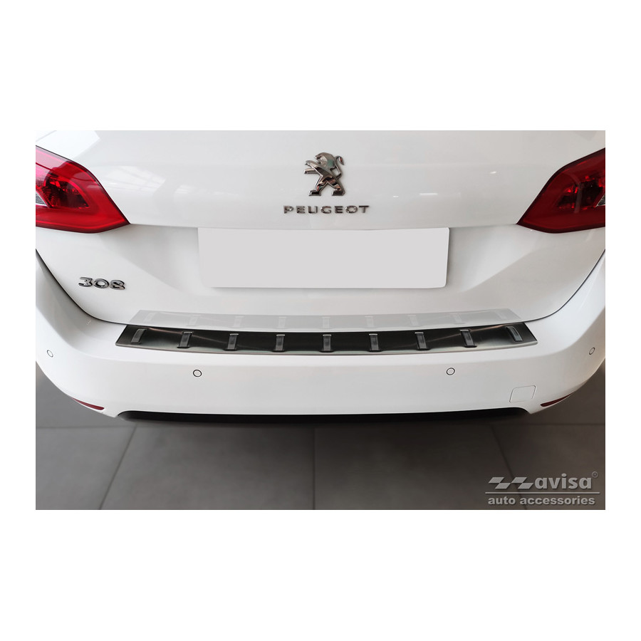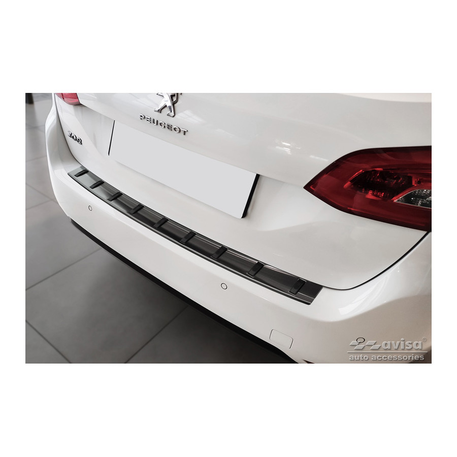 Black Stainless Steel Rear Bumper Protector suitable for Peugeot 308 SW II 2013-2017 & Facelift 2017-2021 'STRONG EDITION' Provide optimal protection against daily wear and tear on the top of the rear bumper. This part of the car is very sensitive to damage caused by loading and unloading items. The costs for repair and refinishing are high, and the value of your car can decrease. With a rear bumper protector you prevent damage to the top of your rear bumper. These are tailor-made for your type of car, and mold to the bumper of your car, resulting in a perfect fit.Material:The Avisa 'STRONG EDITION' protective moldings are made of stainless steel combined with Ribs of hardened polyurethane, which in addition to protection, it also provides a stylish look to your car. The material is sturdy, durable and resistant to all weather influences. This makes the frame last for years. With more than 30 years of experience, Avisa is a leader in the design and production of these protective frames. These are available in different colors and styles. Assembly: These protective strips are very easy to assemble. They are attached by means of double-sided 3M tape, this does not damage the original paint. This is included in the package, as are full schematic assembly instructions. Installation takes approximately 10 minutes. A primer is included for a selection of rear bumper protectors that attach directly to unpainted bumpers. The primer enhances the strength of the 3M tape.