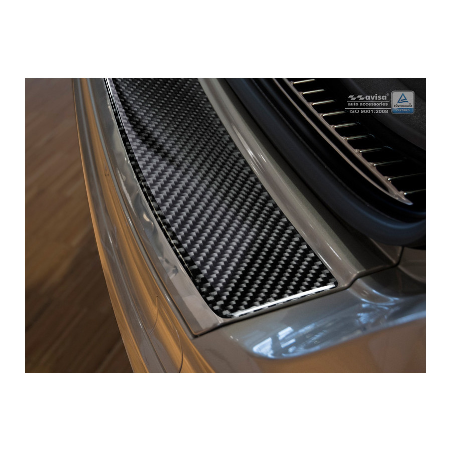 The molding is made of genuine carbon fiber, so it won't damage the original paint. It's a custom-fit molding that completely protects the upper section of the rear bumper. The moldings are CNC-cut and laser-cut to ensure a perfect fit.