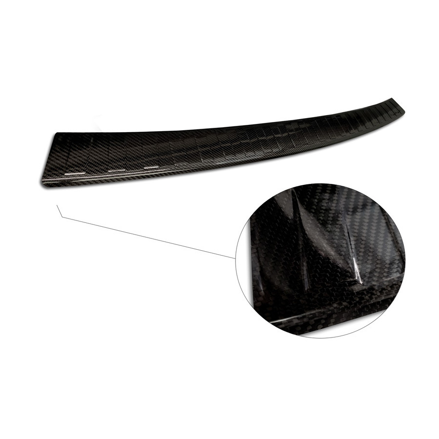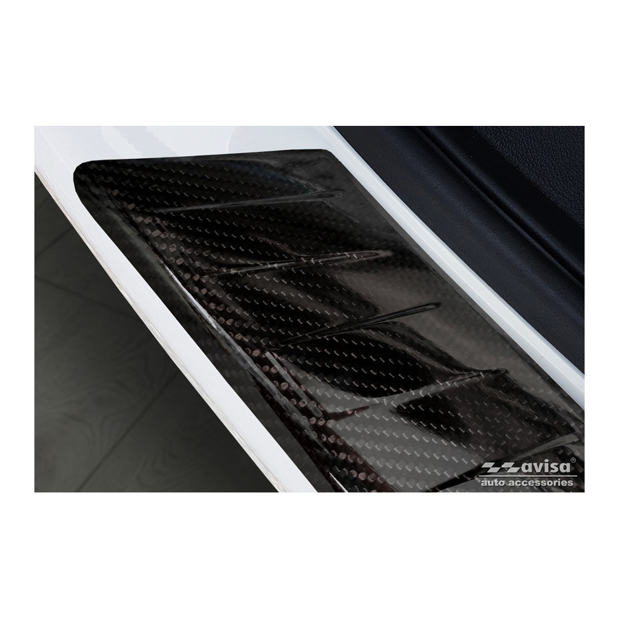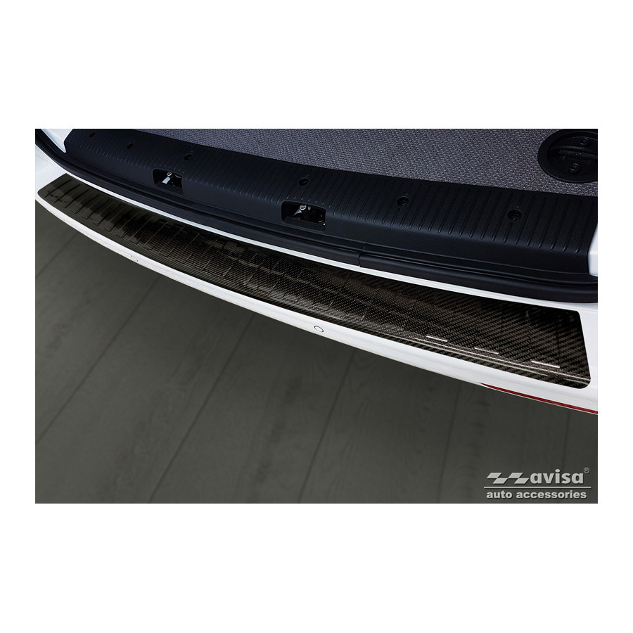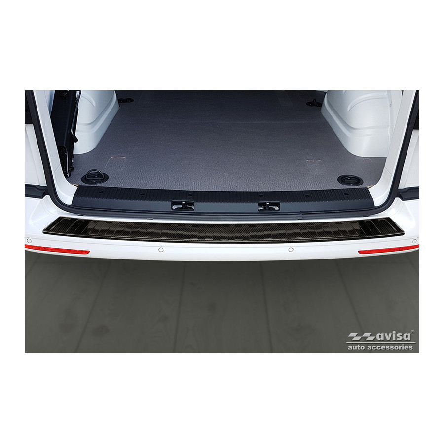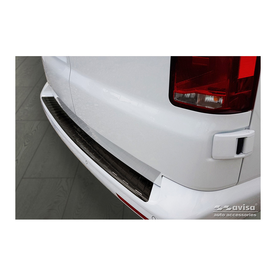 Genuine 3D Carbon Fiber Rear Bumper Protector suitable for Volkswagen Transporter T5 2003-2015 & T6 2015-2010 & T6.1 2020-2022 'Ribs'. Provide optimal protection against daily wear and tear on the top of the rear bumper. This part of the car is very susceptible to damage from loading and unloading. Repair and respray costs are high, and the value of your car can decrease. A rear bumper protector prevents damage to the top of your rear bumper. These are custom-made for your car and conform to your bumper, resulting in a perfect fit. Material: These Avisa protectors are made of genuine 3D carbon fiber, which not only provides good protection but also gives your car a sporty look. Due to its material properties, carbon fiber is very lightweight and also has good fatigue resistance; it can withstand pressure and continuous use. In addition, the durable material is designed to protect against UV rays and prevent discoloration. This ensures the frame will remain in its original shape for years to come. With over 30 years of experience, Avisa is a leader in the design and production of these protective frames. They are available in various colors and styles. Installation: These protective frames are very easy to install. They are attached with double-sided 3M tape, which will not damage the original paint. This is included in the package, along with complete schematic installation instructions. Installation takes approximately 10 minutes.