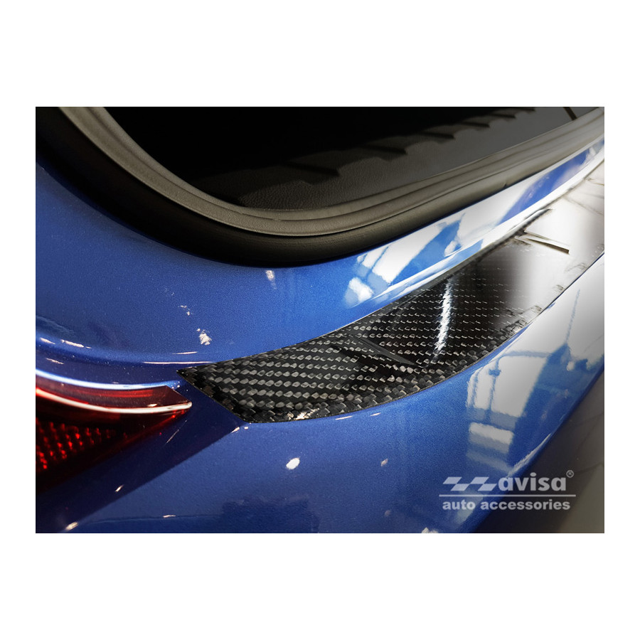 The molding is made of genuine carbon fiber, so it won't damage the original paint. It's a custom-fit molding that completely protects the upper section of the rear bumper. The moldings are CNC-cut and laser-cut to ensure a perfect fit.