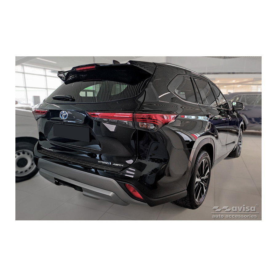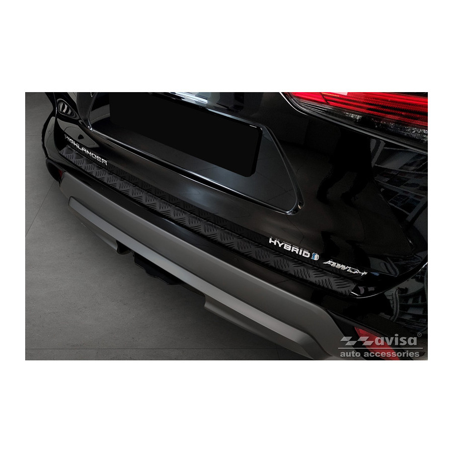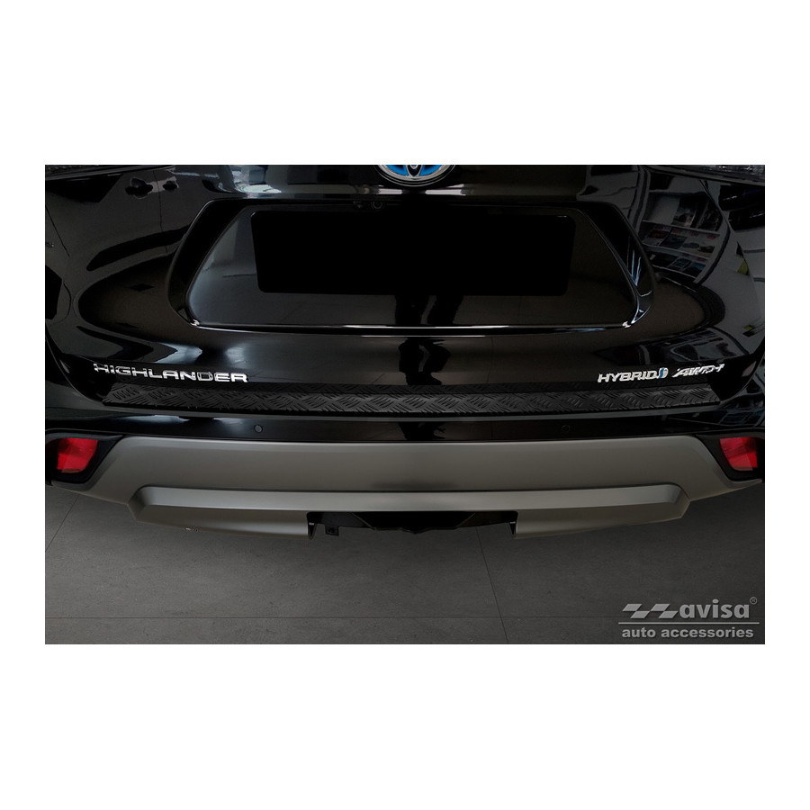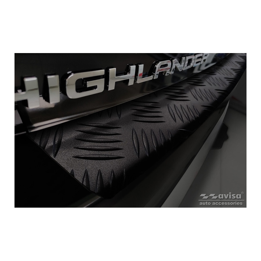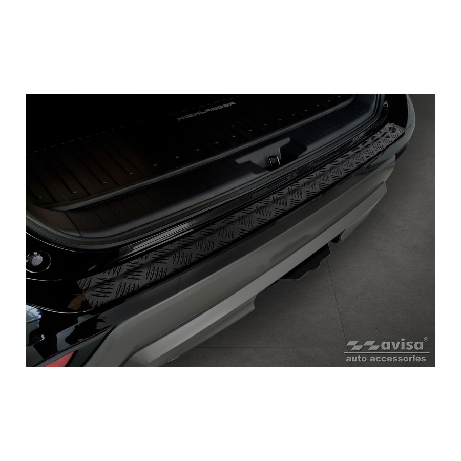Matte Black Aluminum Rear Bumper Protector suitable for Toyota Highlander IV (XU70) 2020- 'Riffled Plate'Provide optimal protection against daily wear and tear on the top of the rear bumper. This part of the car is very sensitive to damage from loading and unloading. Repair and respraying costs are high, and the value of your car can decrease.