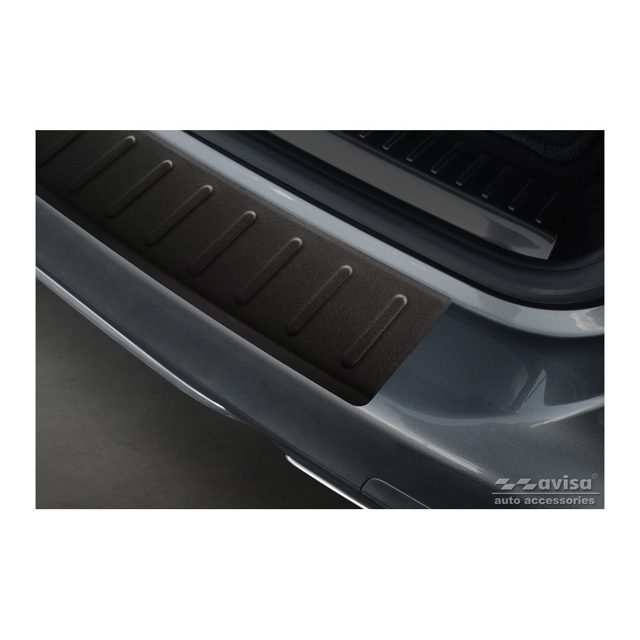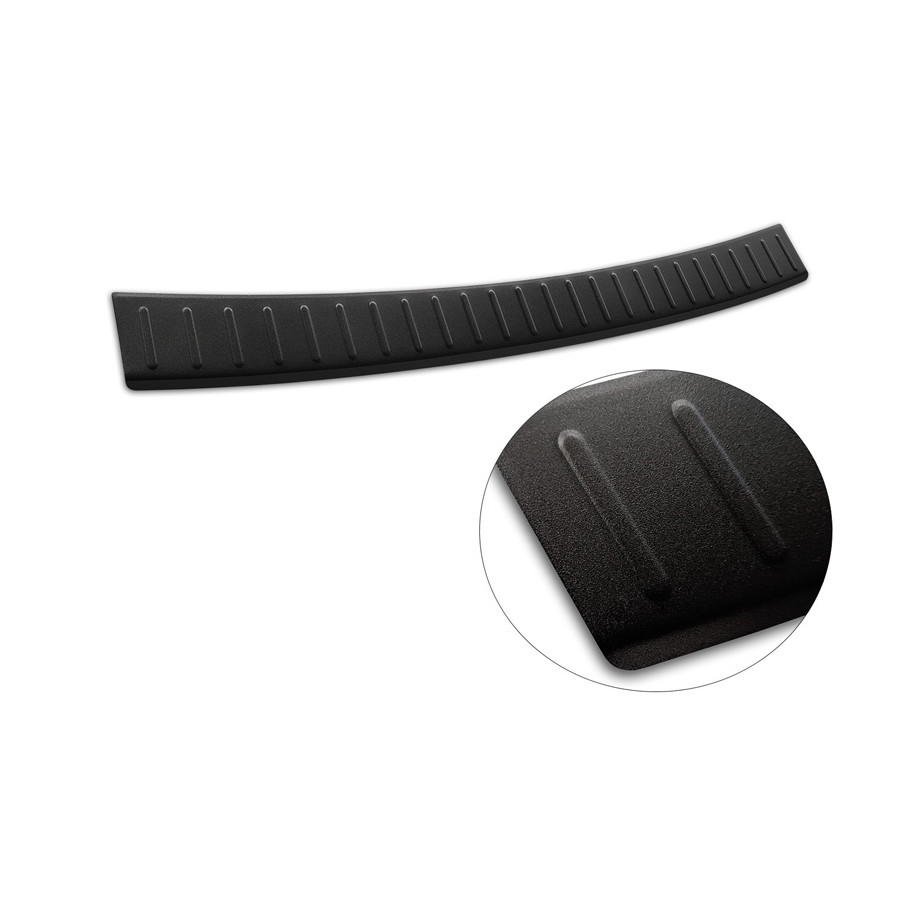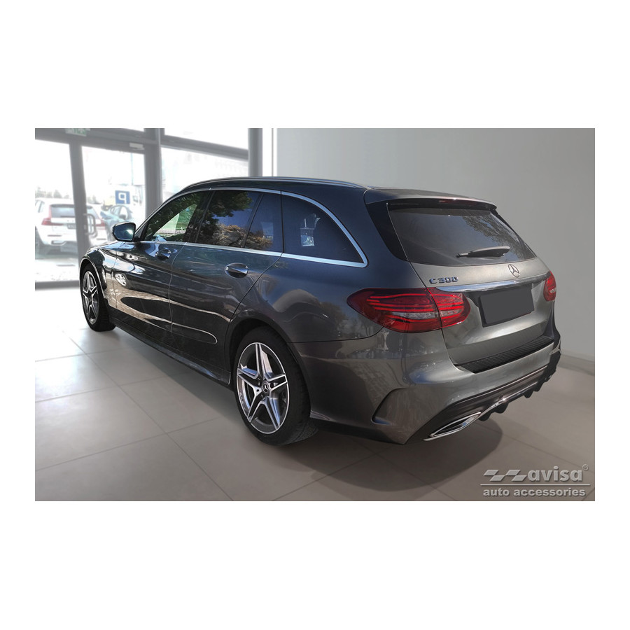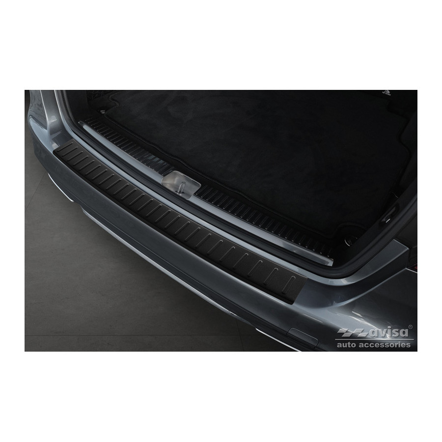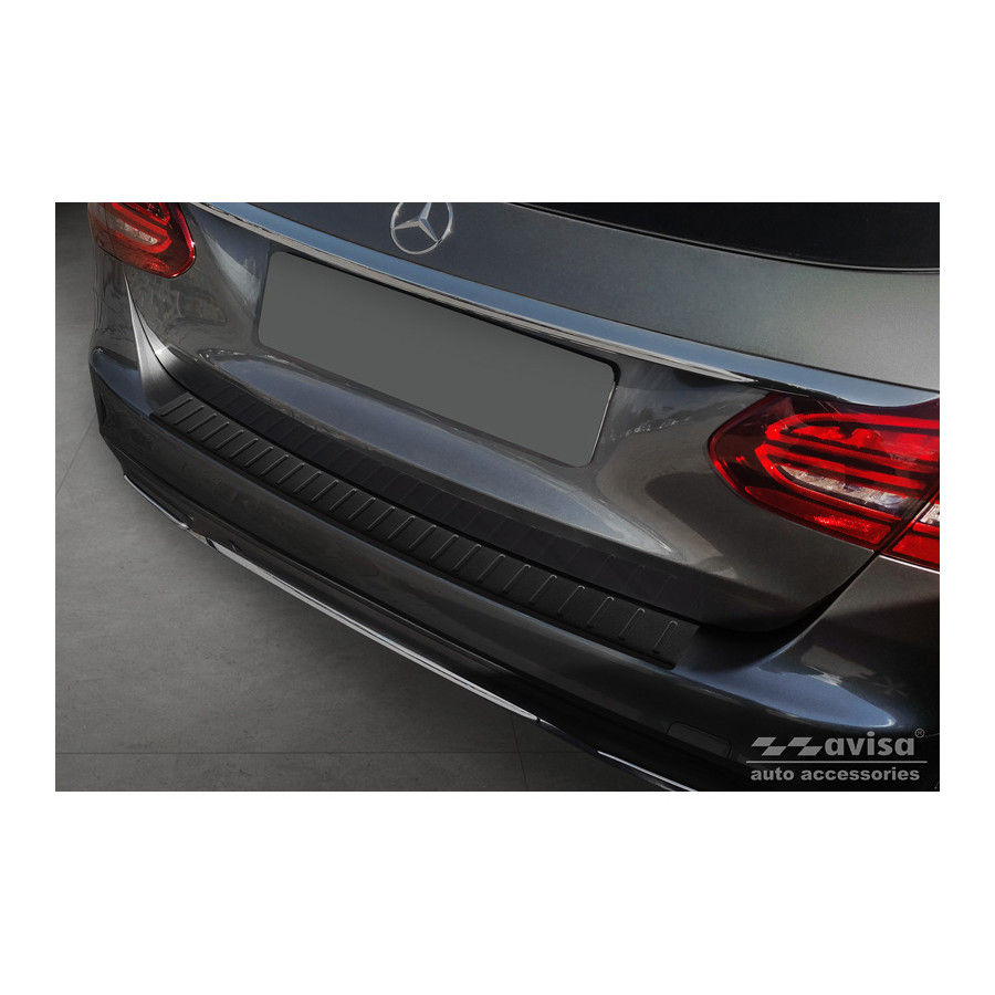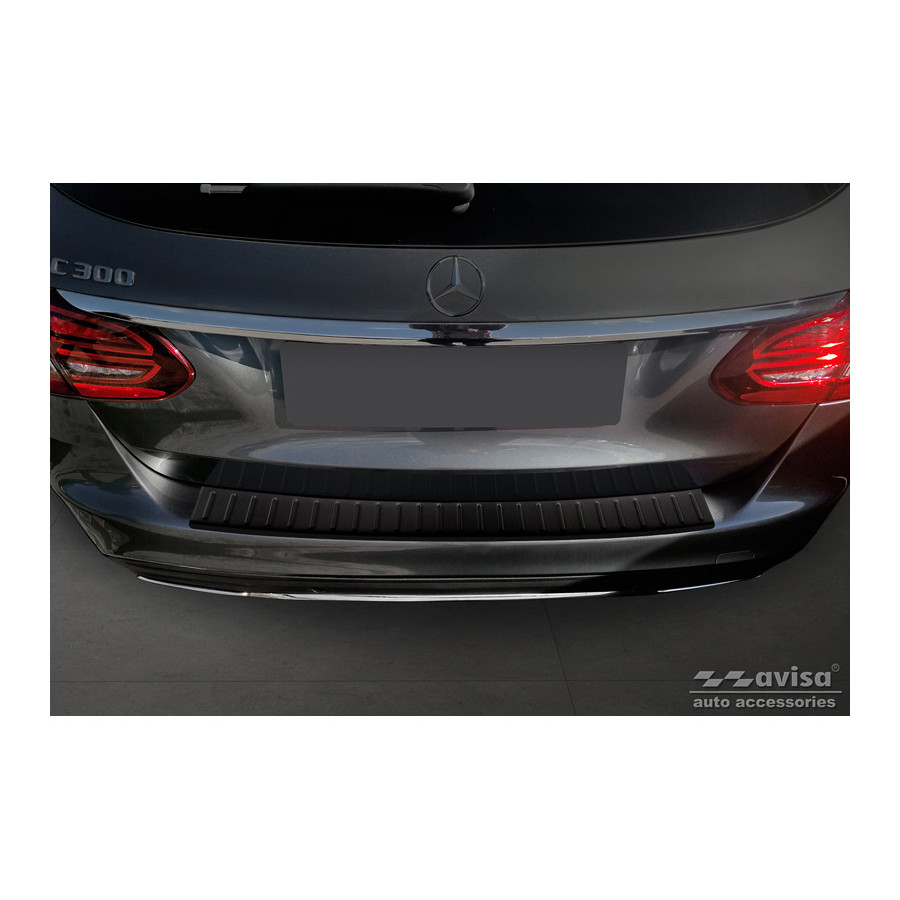 Matte black stainless steel rear bumper protector suitable for Mercedes C-Class W205 Estate 2014-2021. "Ribs" provides optimal protection against daily wear and tear on the top of the rear bumper. This part of the car is particularly susceptible to damage from loading and unloading. Repair and repainting costs are high, and the value of your car can decrease.