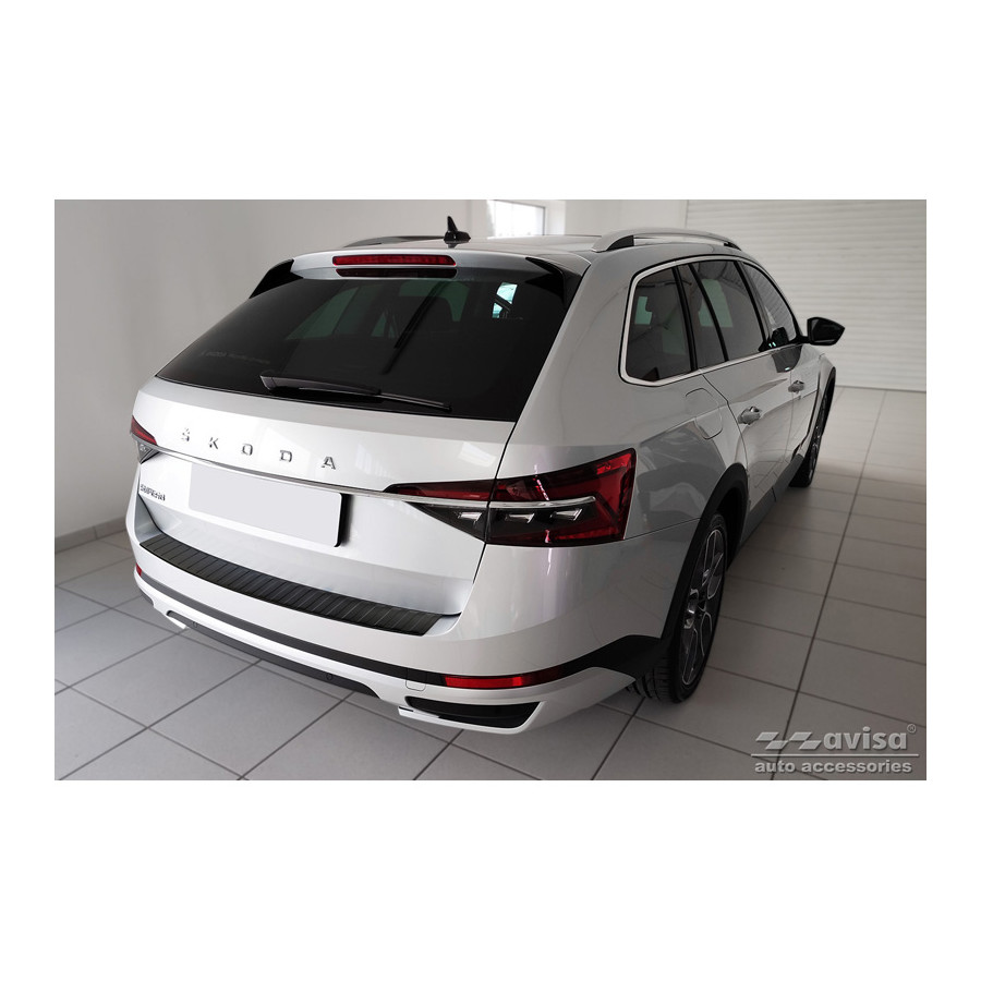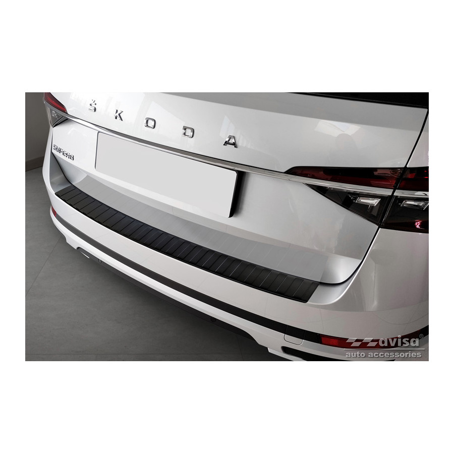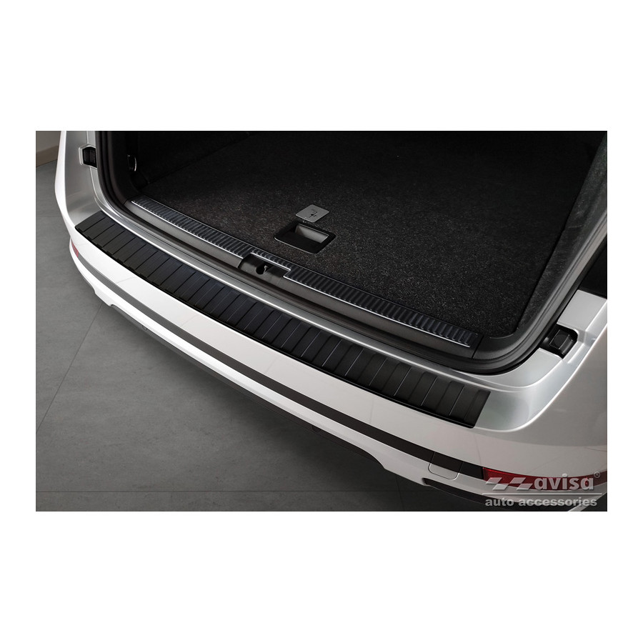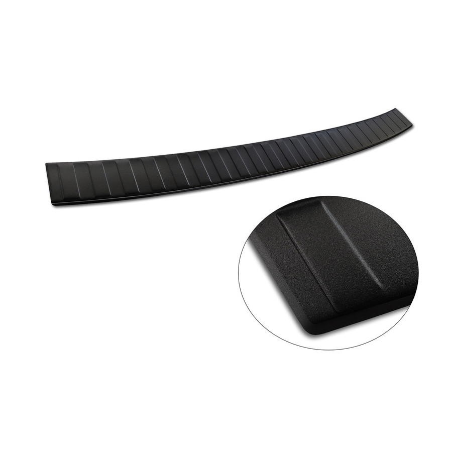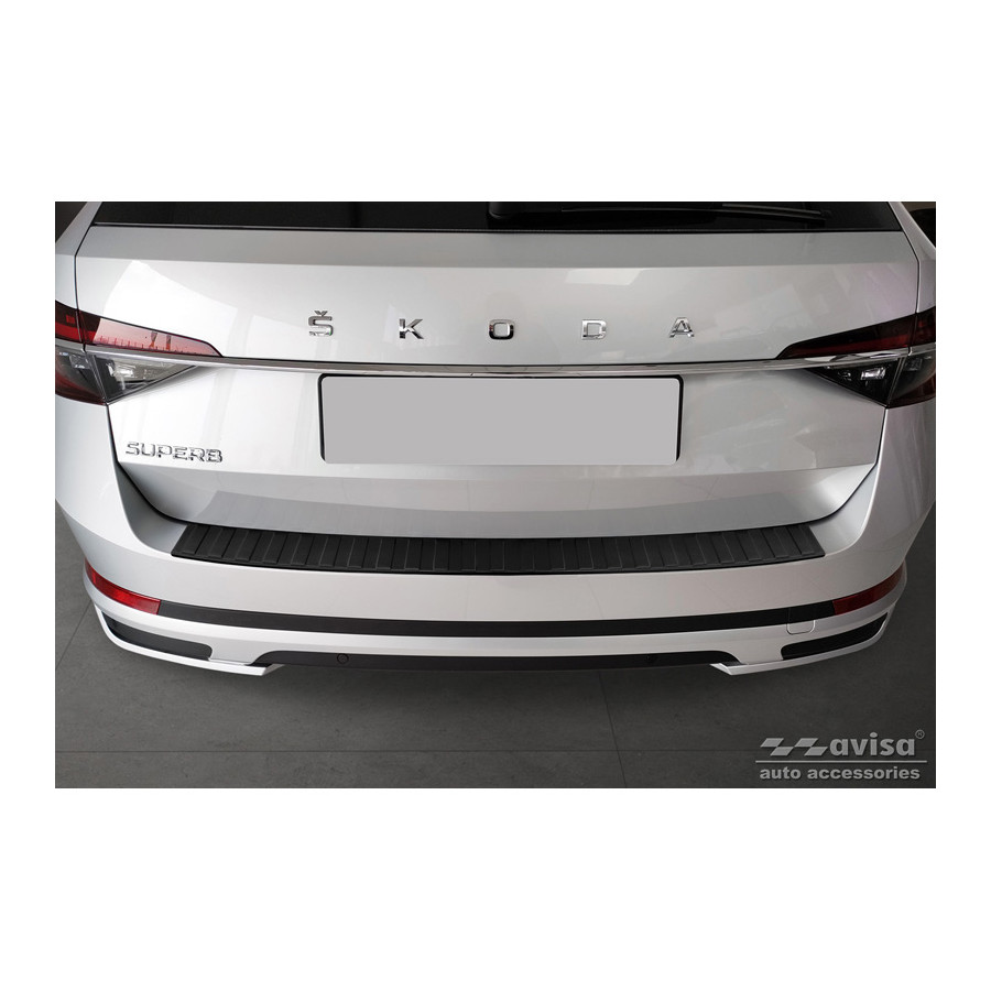 Matte black stainless steel rear bumper protector suitable for Skoda Superb III Estate 2015-2019 & Facelift 2019- incl. Scout 2019- 'Ribs'. Provides optimal protection against daily wear and tear on the top of the rear bumper. This part of the car is particularly susceptible to damage from loading and unloading. Repair and respray costs are high, and the value of your car can decrease.