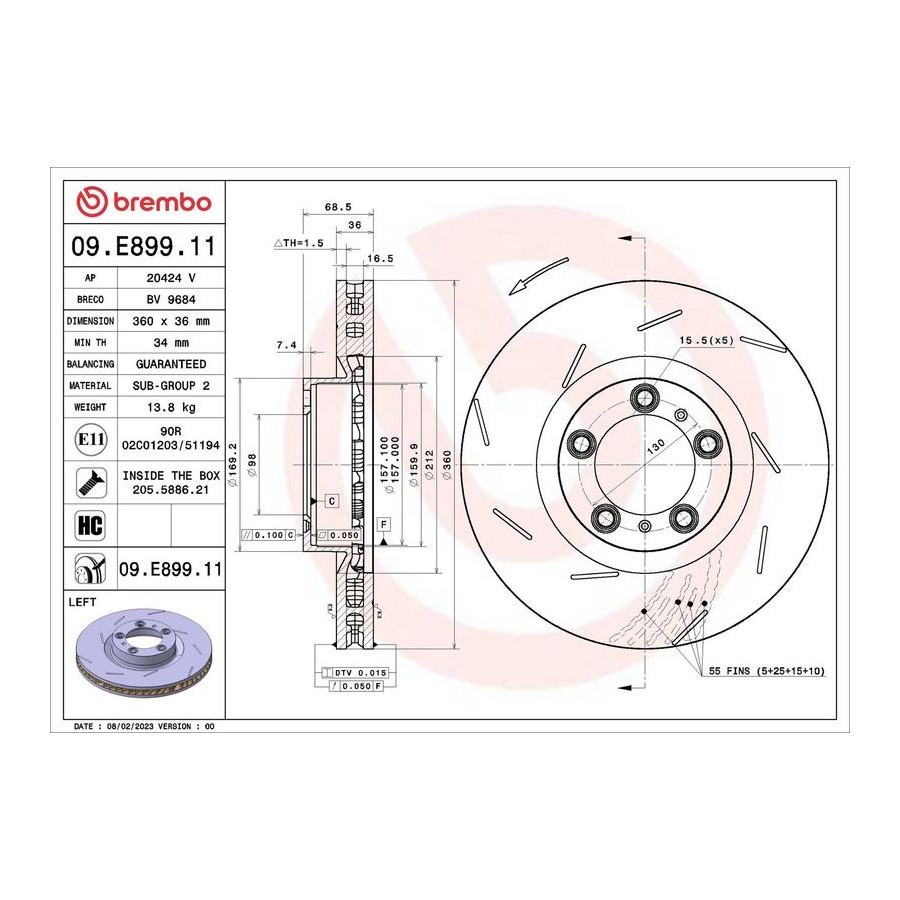 Outer diameter [mm] 360 Brake Disc Type Internal ventilation Surface Coated Number of Holes 5 Brake pads Exclusive Brake Disc Type Notched Centering Diameter [mm] 98 Machining High-carbon Warranty 2 years Height [mm] 68,5 Additional information With screws Brake disc thickness (mm) 36 Minimum thickness (mm) 34 Similar products of other manufacturers