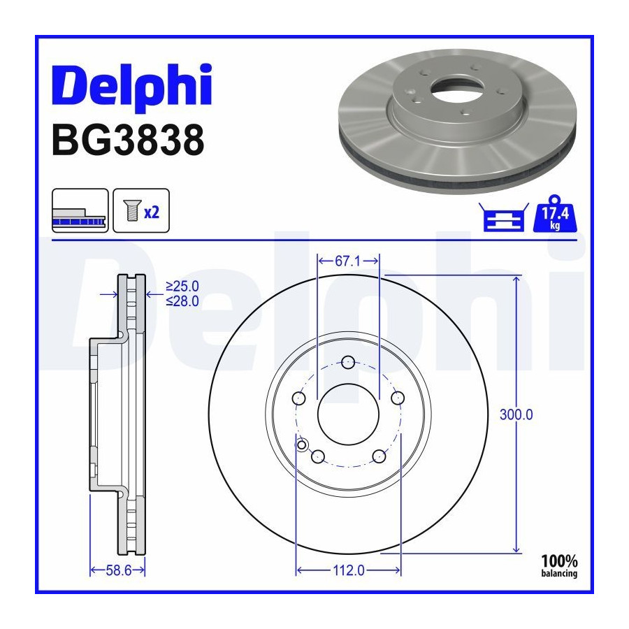 Outer diameter [mm] 300 Fitting Position Front Axle Brake Disc Type Vented Surface No coating Oiled Number of Holes 5 Brake pads Exclusive Centering Diameter [mm] 67,1 Inspection Tag E1 90R-02C0958/2527 Warranty 2 years Height [mm] 58,6 Brake disc thickness (mm) 28 Minimum thickness (mm) 25 Similar products of other manufacturers