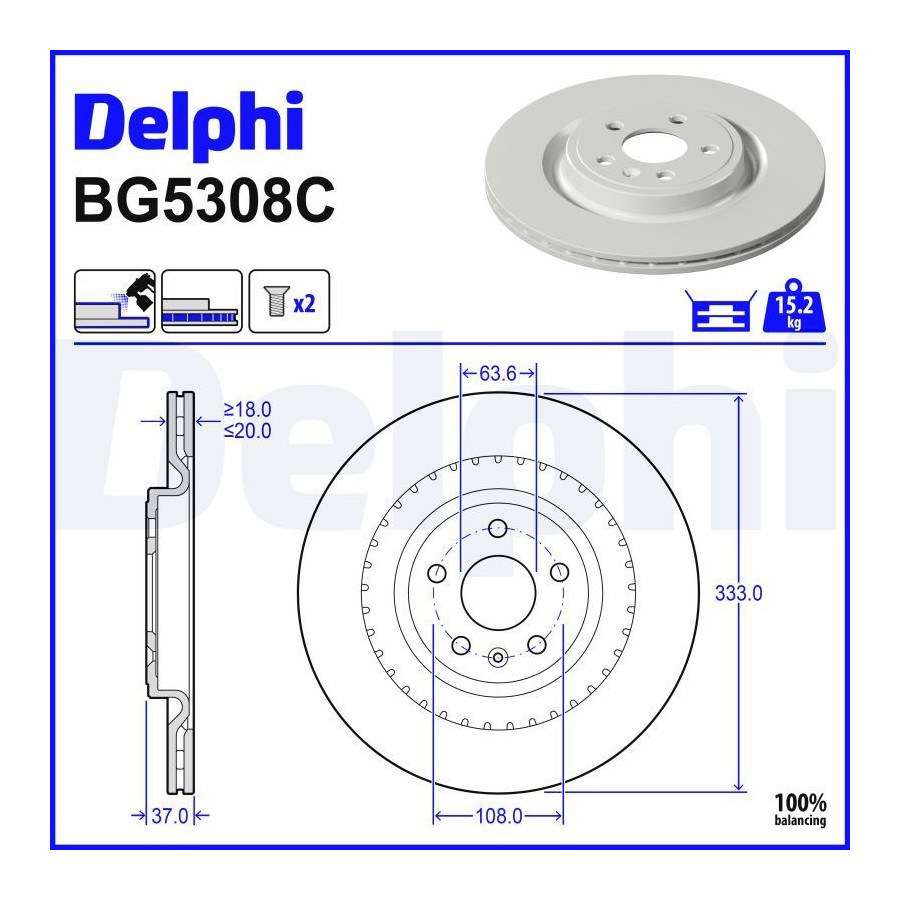 Outer diameter [mm] 333 Brake Disc Type Vented Surface Coated Number of Holes 5 Brake pads Exclusive Centering Diameter [mm] 63,6 Inspection Tag E4 90R-02C0703/3275 Warranty 2 years Height [mm] 37 Brake disc thickness (mm) 20 Minimum thickness (mm) 18 -