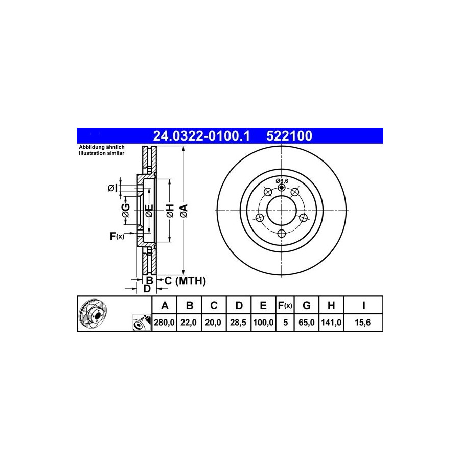 Outer diameter [mm] 280,0 Brake Disc Type Vented Surface Coated Number of Holes 5 Assembly Front Brake pads Exclusive Inner diameter [mm] 141,0 Bolt Hole Circle Ø [mm] 100,0 Centering Diameter [mm] 65,0 Machining High-carbon Bore Ø [mm] 15,6 MAPP code available Warranty 2 years application Ventilated disc PowerDisc Height [mm] 28,5 Brake disc thickness (mm) 22,0 Minimum thickness (mm) 20,0 Similar products of other manufacturers