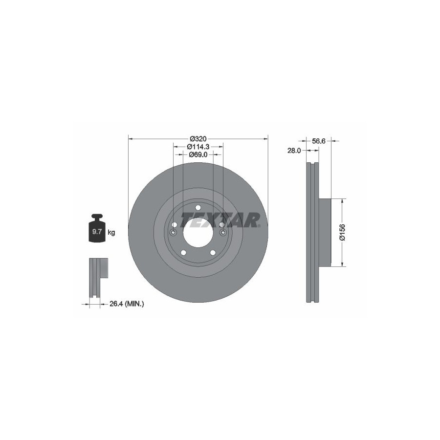 Outer diameter [mm] 320 Brake Disc Type Internal ventilation Surface Coated Brake pads Exclusive Inner diameter [mm] 144,3 Bolt Hole Circle Ø [mm] 114,3 Centering Diameter [mm] 69 Hole Arrangement / Number 05/07 Packaging length [cm] 32,8 Packaging width [cm] 32,8 Packaging height [cm] 7,5 Warranty 2 years Height [mm] 56,6 Additional information Without wheel hub Without wheel studs Without wheel bearing Brake disc thickness (mm) 28 Minimum thickness (mm) 26,4 Weight [kg] 9,7 Hole diameter for wheel bolt [inch] 12,6 Similar products of other manufacturers