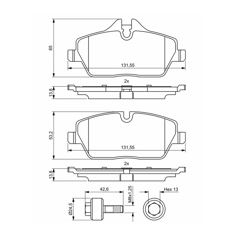 Wear Warning Contact Without wear indicator Content Set (4 brake pads per axle) Material Low-Metallic Supplementary Article/Info 2 With anti-squeak plate With screws Supplementary Article/Supplementary Info With accessories Part number of recommended accessories 1 987 473 542 WVA Number 25913 Inspection Tag ECE-R90 Number of screws 4 Warranty 2 years Width [mm] 131,6 Thickness [mm] 13,8 Height 1 (mm) 53,2 Height 2 (mm) 65 Product must be determined by vehicle or engine Similar products of other manufacturers