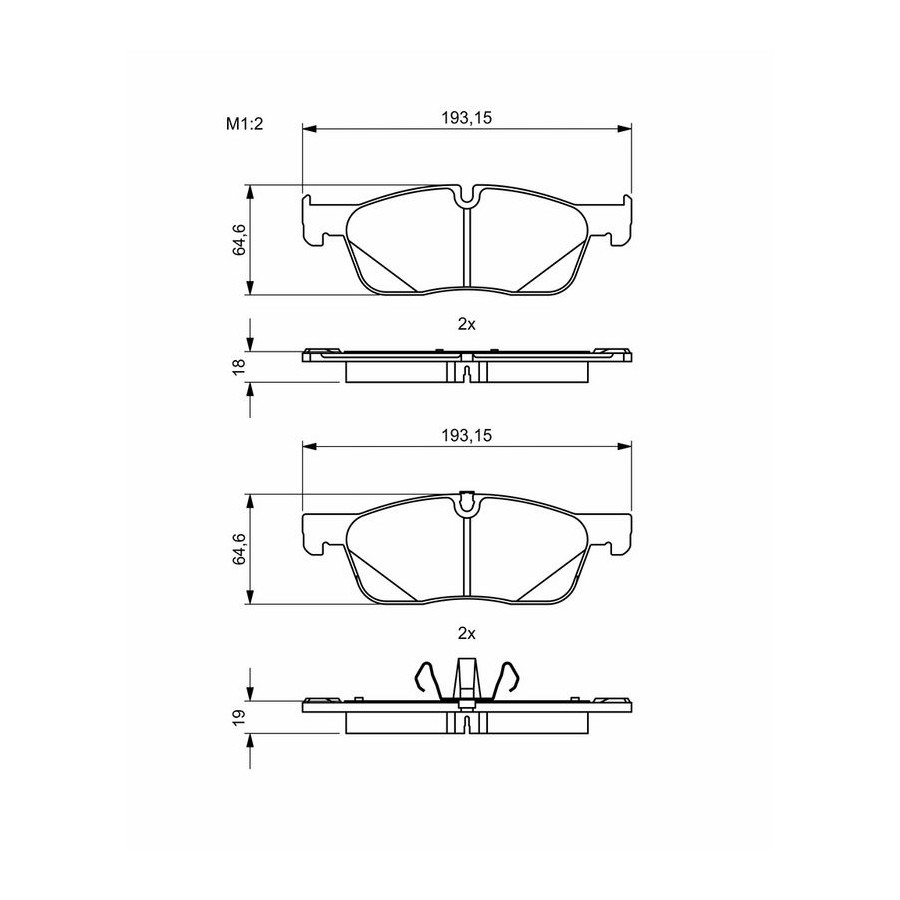 Wear Warning Contact Without wear indicator Content Set (4 brake pads per axle) Material Low-Metallic Supplementary Article/Info 2 With piston clip With anti-squeak plate Part number of recommended accessories 1 987 474 306 1 987 473 589 WVA Number 22145 Inspection Tag ECE-R90 Warranty 2 years Height [mm] 65,5 Width [mm] 193,2 Thickness 1 [mm] 18,3 Thickness 2 [mm] 19,3 Product must be determined by vehicle or engine Similar products of other manufacturers
