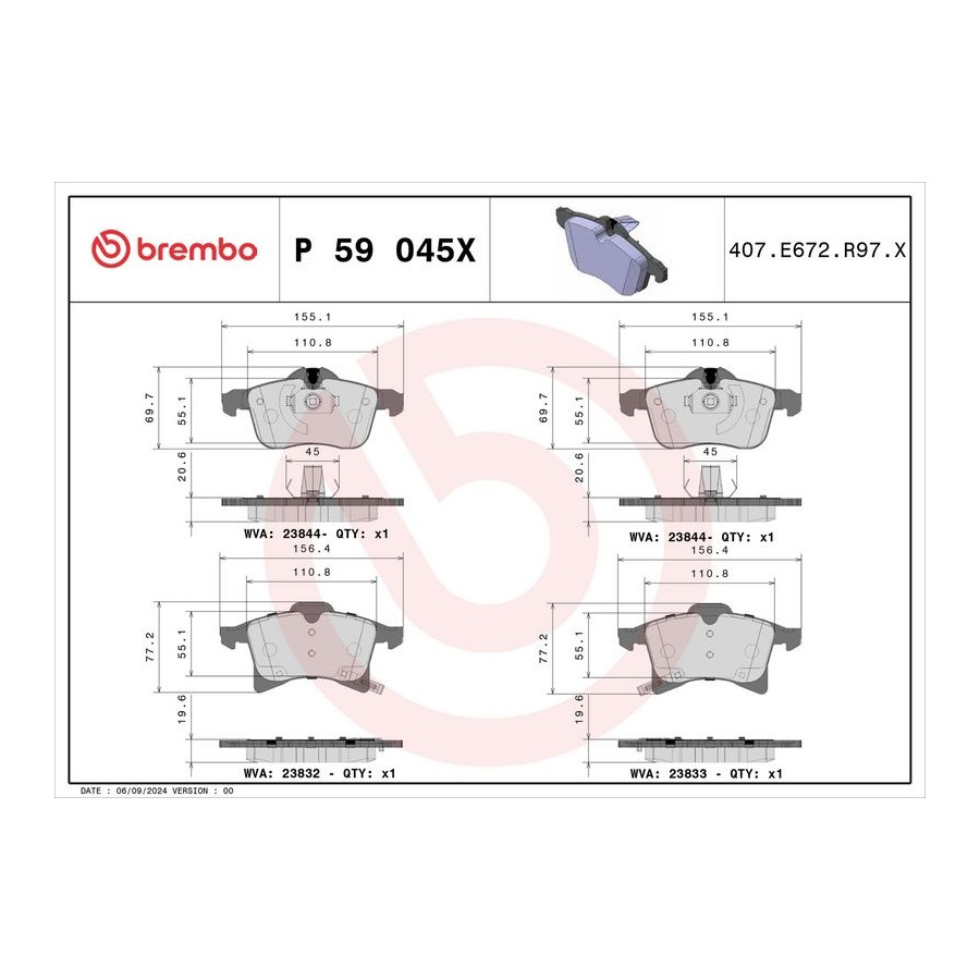 Manufacturer Manufacturer number Price A.B.S. 37361 ASHIKA 50-00-0073 ASHIKA 50-00-0032 ATE 13.0470-7179.2 ATE 13.0460-7116.2 ATE 13.0460-7179.2 ATE 13.0470-7116.2 BARUM BA2211 BARUM BA2255 BELACO BPD1022 BLUE PRINT ADZ94240 BOSCH 0 986 424 707 BOSCH 0 986 424 457 BREMBO P 59 045X (this product) BREMSI BP3093 BSG BSG 65-200-005 CHAMPION 571975CH CHAMPION 573153CH COMLINE CBP3583 DELPHI LP1861 DENCKERMANN B110251 DENCKERMANN B111002 DON PCP1015 Dr!ve+ DP1010.10.0439 Dr!ve+ DP1010.10.0814 FEBI BILSTEIN 16603 FEBI BILSTEIN 16491 FERODO FDB1640 FERODO FDB1295 FTE 9010724 GALFER B1.G102-0550.2 GALFER B1.G102-0765.2 HELLA 8DB 355 009-221 HERTH+BUSS JAKOPARTS J3600922 JAPANPARTS PA-0032AF JAPANPARTS PA-0073AF JAPKO 500032 JAPKO 500073 JURID 571975J JURID 573153D JURID 573153J KAISHIN FK20014 KAMOKA JQ1013280 Manufacturer Manufacturer number Price LORO 231-01-005 MAGNETI MARELLI 363916060523 MAGNETI MARELLI 363916060364 MAGNETI MARELLI 363700559045 MAPCO 6710/1 MAPCO 6710 MASTER-SPORT 13046071792N-SET-MSP MASTER-SPORT 13046071792N-SET-MS MASTER-SPORT 13046071162N-SET-MS MASTER-SPORT 13046071162N-SET-MSP MAXGEAR 19-0641 MEYLE 025 283 3219/PD MINTEX MDB2633 MOTAQUIP LVXL286 OPEN PARTS BPA1036.02 OPTIMAL BP-10288 OPTIMAL BP-12174 Omnicraft 2134850 PAGID T1225N QUARO QP7965C QUARO QP7965 REMSA 1036.02 ROADHOUSE 21036.02 ROTINGER RT 2PD18619HP ROTINGER RT 2PD18610 STELLOX 1047 002B-SX STELLOX 1047 002-SX SWAG 40 91 6603 SWAG 40 91 6491 TEXTAR 2383281 TEXTAR 2383201 TOPRAN 206 509 TOPRAN 205 781 VALEO 598860 VALEO 598454 VALEO 301454 VALEO 301860 VALEO 872832 WOKING P11363.02 ZIMMERMANN 23832.200.2 ZIMMERMANN 23057.995.1 ZIMMERMANN 23057.195.1 ZIMMERMANN 23832.900.2 -