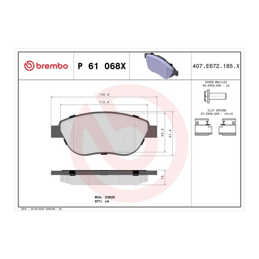 Manufacturer Manufacturer number Price A.B.S. 37273 AISIN BPPE-1036 ASHIKA 50-00-0276 ASHIKA 50-00-0080 ATE 13.0460-3966.2 ATE 13.0460-3811.2 ATE 13.0470-3966.2 BARUM BA2289 BARUM BA2229 BELACO BPD1475 BELACO BPD1043 BLUE PRINT ADP154218 BOSCH 0 986 494 038 BOSCH 0 986 494 602 BREMBO P 61 068X (this product) BREMSI BP2972 BSG BSG 70-200-002 CHAMPION 573031CH DELPHI LP1653 DENCKERMANN B110599 DON PCP1350 DON PCP1088 Dr!ve+ DP1010.10.0849 FEBI BILSTEIN 16422 FERODO FDB5028 FTE 9010364 GALFER B1.G102-0735.2 GALFER B1.G102-0614.2 HELLA 8DB 355 018-871 JAPANPARTS PA-0276AF JAPANPARTS PA-0080AF JAPKO 500080 JAPKO 500276 JURID 573031JC JURID 573031J KAMOKA JQ1012952 LORO 231-01-019 Manufacturer Manufacturer number Price MAGNETI MARELLI 363916060176 MAGNETI MARELLI 363916060558 MAGNETI MARELLI 363700561068 MAPCO 6548/1 MASTER-SPORT 236038112P MASTER-SPORT 13046039662T-SET-MSP MASTER-SPORT 13046039662N-SET-MSP MASTER-SPORT 13046039662T-SET-MS MASTER-SPORT 13046039662N-SET-MS MASTER-SPORT 236038112 MAXGEAR 19-0576 MEYLE 025 236 0019/PD MEYLE 025 236 0019 MEYLE 025 237 0819 MINTEX MDB2186 MINTEX MDB2663 OPEN PARTS BPA0841.00 Omnicraft 2134852 PAGID T1449N QUARO QP3797 QUARO QP3797C REMSA 0841.00 ROADHOUSE 2841.00 ROTINGER RT 2PD16539HP ROTINGER RT 2PD16530 SWAG 62 91 6422 TEXTAR 2360001 TEXTAR 2370803 TOPRAN 721 238 TOPRAN 721 239 TRISCAN 8110 28022 VALEO 872600 VALEO 301465 VALEO 601465 VALEO 301465A VALEO 598465 WOKING P9413.00 -