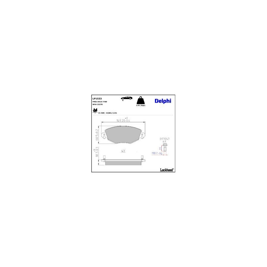 Fitting Position Front Axle braking System BOSCH Wear Warning Contact Without wear indicator Width 1 [mm] 149,2 Width 2 [mm] 149,2 Content Set (4 brake pads per axle) Supplementary Article/Info 2 With anti-squeak plate Supplementary Article/Supplementary Info With accessories Wear Warning Contact Not prepared for wear warning WVA Number 23278 Inspection Tag E1 90R-01881/1151 Warranty 2 years Thickness 1 [mm] 18 Thickness 2 [mm] 18 Clutch Liner Material Low-Metallic Height 1 (mm) 60,5 Height 2 (mm) 60,5 FMSI code D910-7789 Similar products of other manufacturers