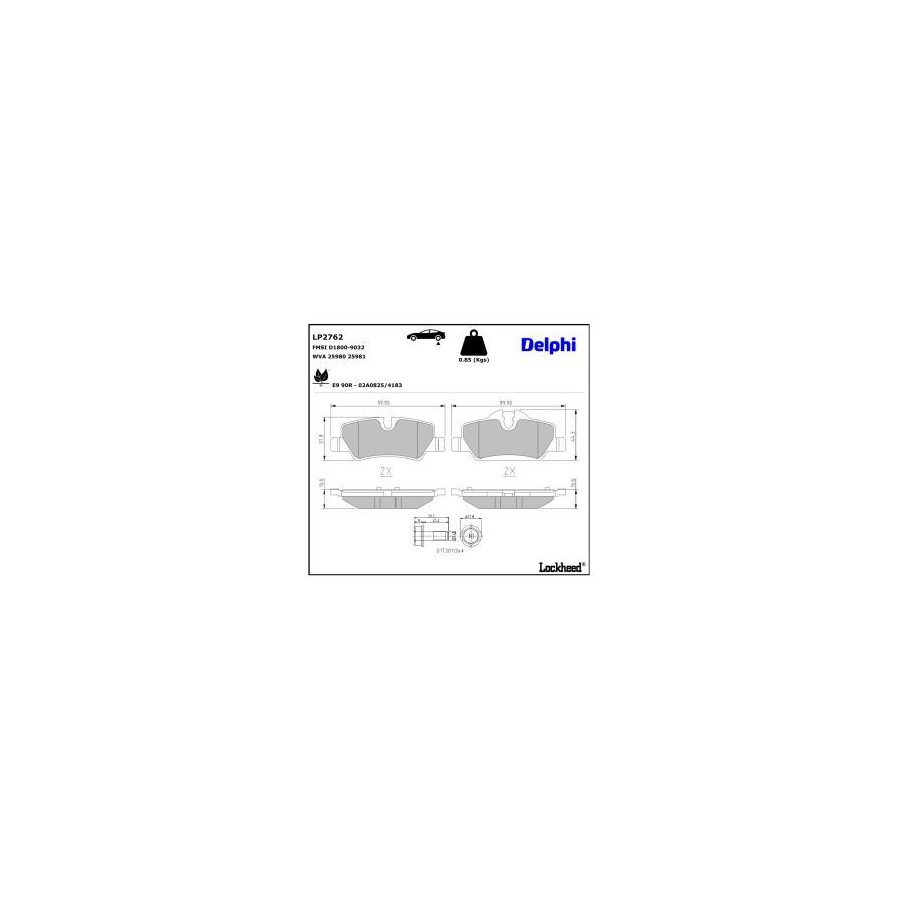 Manufacturer Manufacturer number Price A.B.S. 35049 ABE C2B033ABE AISIN BPBM-2019 ASHIKA 51-00-0118 ASHUKI P1-1621 ATE 13.0460-2797.2 ATE 13.0470-2797.2 BELACO BPD1118 BLUE PRINT ADB114216 BORG & BECK BBP2495 BOSCH 0 986 495 427 BOSCH 0 986 495 400 BRAXIS AA0661 BRAXIS AB0748 BREMBO P 06 090 BREMSI BP3632 CAR PNT9202 CHAMPION 573763CH CIFAM 822-1014-0 COMLINE CBP02262 DELPHI LP2762 (this product) DENCKERMANN B111423 DJ PARTS BP2752 DON PCP2012 Dr!ve+ DP1010.10.1232 EUROBRAKE 5502221570 FAI AutoParts FPBP579 FAI AutoParts BP198 FEBI BILSTEIN 116290 FERODO FDB4946 FREMAX FBP-0003 FTE 9011009 GALFER B1.G120-1267.2 GIRLING 6120881 HELLA 8DB 355 021-481 HERTH+BUSS JAKOPARTS J3610836 ICER 182190 JAPANPARTS PP-0118AF JAPKO 510118 JURATEK JCP8137 JURID 573763J KAISHIN FK10306 KAMOKA JQ101502 Manufacturer Manufacturer number Price KAWE 1600 00 KEY PARTS KBP2495 KRAFT AUTOMOTIVE 6012650 LORO 231-02-190 LPR 05P2029 MAGNETI MARELLI 363916060934 MAGNETI MARELLI 363700406090 MAPCO 6018 MAPCO 6018HPS MASTER-SPORT 13046027972N-SET-MS MASTER-SPORT 13046027972N-SET-MSP MAXGEAR 19-3887 METELLI 22-1014-0 METZGER 1170819 MEYLE 025 259 8016 MEYLE 025 259 8016/PD MINTEX MDB3438 MOTAQUIP LVXL1848 NATIONAL NP2805 NK 221570 OPEN PARTS BPA1600.00 OPTIMAL BP-12710 PAGID T2341N QUARO QP4538 QUARO QP4538C QUINTON HAZELL BP1858 R BRAKE RB2190 REMSA 1600.00 ROADHOUSE 21600.00 ROTINGER RT 1PD27620 SASIC 6216165 SKF VKBP 90124 SWAG 11 11 6290 TEXTAR 2598001 TOPRAN 503 072 TRUSTING 1038.0 TRW GDB2088 VAICO V20-3132 VALEO 302446A VALEO 302446 VALEO 601553 WOKING P17003.00 fri.tech. 1038.0 -