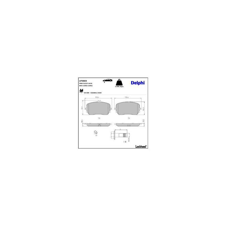 Manufacturer Manufacturer number Price A.B.S. 35281 AISIN BPMB-7015 ATE 13.0460-3889.2 ATE 13.0470-3889.2 BELACO BPD2476 BLUE PRINT ADBP420124 BORG & BECK BBP2855 BOSCH 0 986 460 036 BOSCH 0 986 460 146 BREMBO P 50 149 BREMSI BP4038CE BREMSI BP4038 CIFAM 822-1272-0 COMLINE CBP03526 DELPHI LP3603 (this product) DENCKERMANN B111671 EUROBRAKE 55022233107 FAI AutoParts FPBP741 FEBI BILSTEIN 184232 FERODO FDB5329 FREMAX FBP-3536 FTE 9011183 GALFER B1.G120-1693.2 HELLA 8DB 355 039-211 ICER 182365 Manufacturer Manufacturer number Price JURID 574169J LORO 231-01-386 LPR 05P2244 MAGNETI MARELLI 363916061259 MAPCO 106055 MAPCO 106055HPS MASTER-SPORT 13046038892N-SET-MS MASTER-SPORT 13046038892N-SET-MSP METELLI 22-1272-0 MINTEX MDB4182 MOTAQUIP LVXL2147 NATIONAL NP3191 NK 2233107 PAGID T2842N QUARO QP0962 QUINTON HAZELL BP1993 R BRAKE RB2365 ROTINGER RT 2PD36030 SKF VKBP 81378 SWAG 33 10 9322 TEXTAR 2296201 TRUCKTEC AUTOMOTIVE 02.35.690 TRUSTING 1272.0 VALEO 610588 fri.tech. 1272.0 -