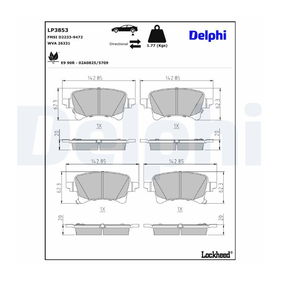 Fitting Position Rear Axle Wear Warning Contact With acoustic wear warning Width 1 [mm] 142,9 Width 2 [mm] 142,9 Supplementary Article/Info 2 With anti-squeak plate Supplementary Article/Supplementary Info Without accessories WVA Number 26331 Inspection Tag E9 90R-02A0825/5709 Warranty 2 years Thickness 1 [mm] 20 Thickness 2 [mm] 20 Height 1 (mm) 62,3 Height 2 (mm) 62,3 FMSI code D2233-9472 Similar products of other manufacturers