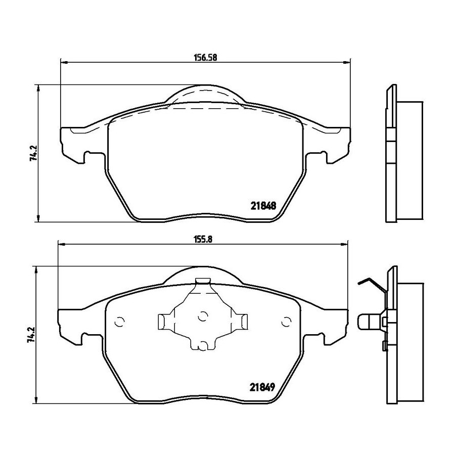 braking System Teves Wear Warning Contact Not prepared for wear indicator Excl. wear warning contact Width 1 [mm] 156 Width 2 [mm] 157 Content Set (4 brake pads per axle) Supplementary Article/Info 2 With piston clip With anti-squeak plate Supplementary Article/Supplementary Info With accessories WVA Number 21848 21849 Directional Warranty 2 years Height [mm] 74 Thickness [mm] 20 Similar products of other manufacturers