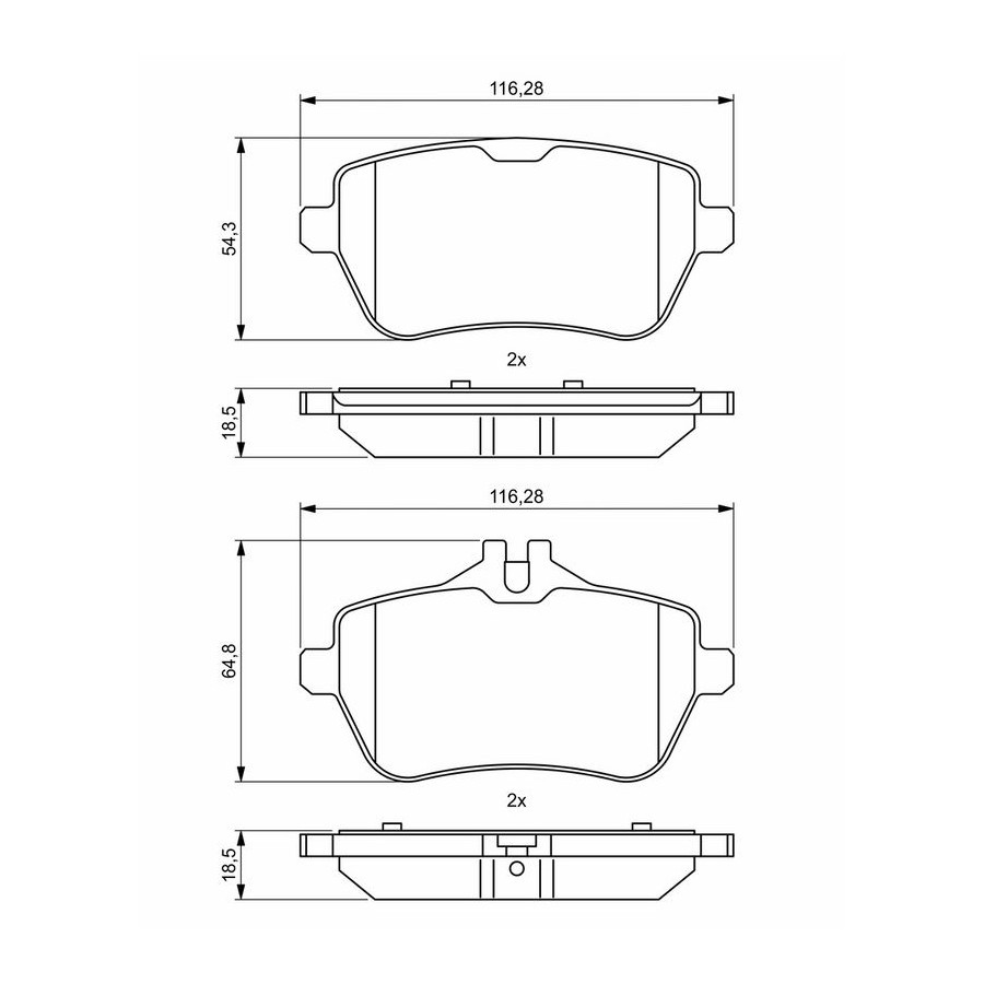 Wear Warning Contact Without wear indicator Content Set (4 brake pads per axle) Material Low-Metallic Supplementary Article/Info 2 With anti-squeak plate Part number of recommended accessories 1 987 473 070 1 987 474 775 1 987 474 470 WVA Number 25071 Inspection Tag ECE-R90 Warranty 2 years Width [mm] 116,1 Thickness [mm] 18,5 Height 1 (mm) 55,3 Height 2 (mm) 65,4 Product must be determined by vehicle or engine Similar products of other manufacturers