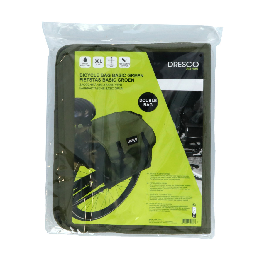 The Dresco double green pannier Basic is a handy, spacious pannier with a 30-liter capacity. Made of water-repellent nylon, the Dresco pannier easily attaches to your bike's rear rack with a hook-and-loop fastener. The pannier closes with a convenient, adjustable snap closure. Reflective accents provide extra visibility in the dark. The pannier measures 30x36x14 cm (2x).