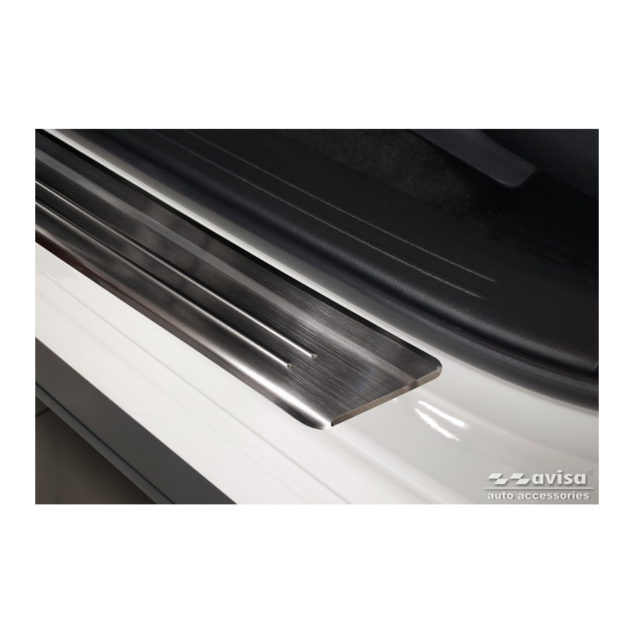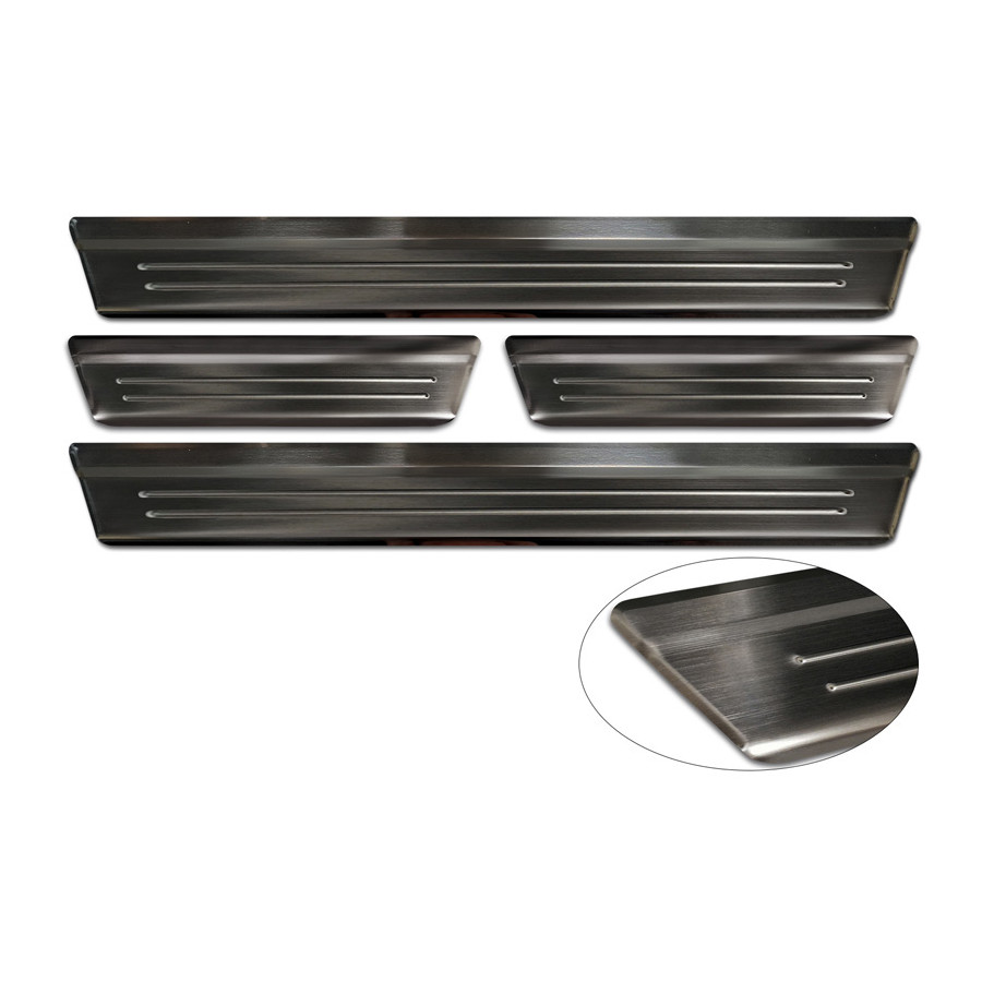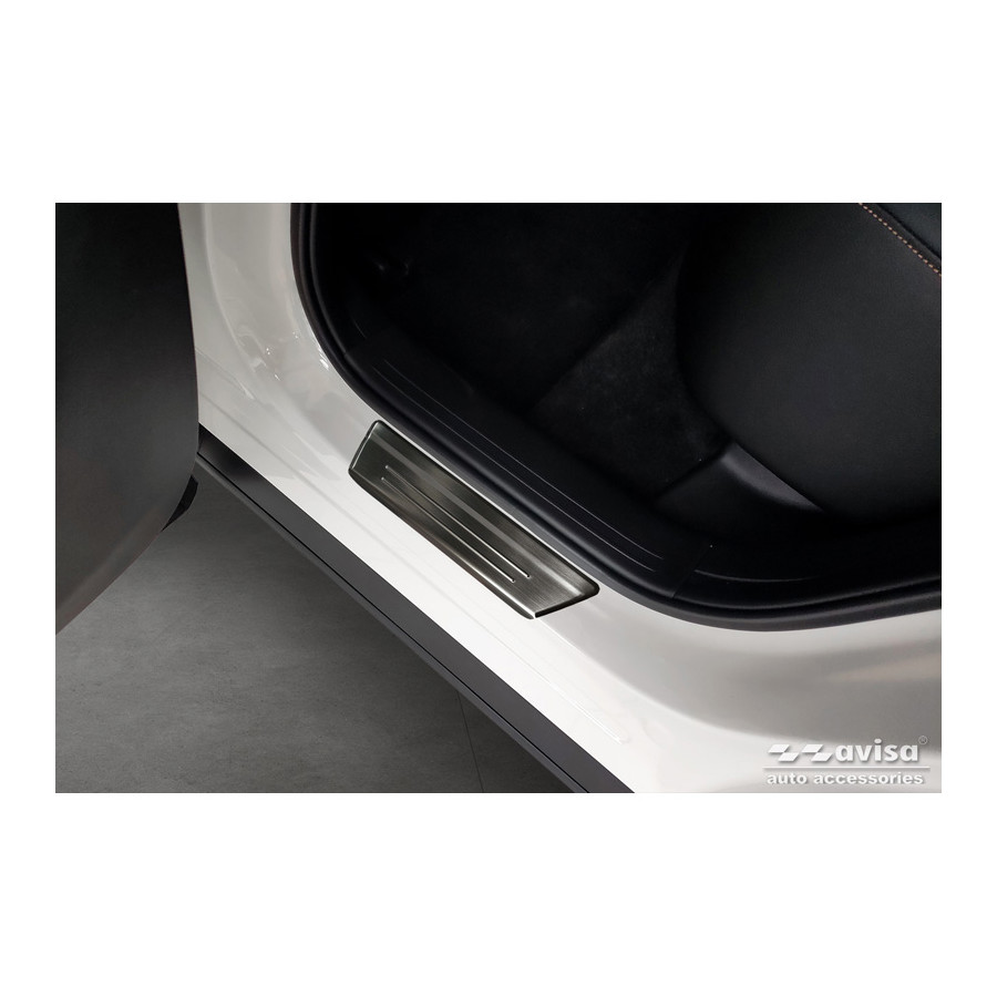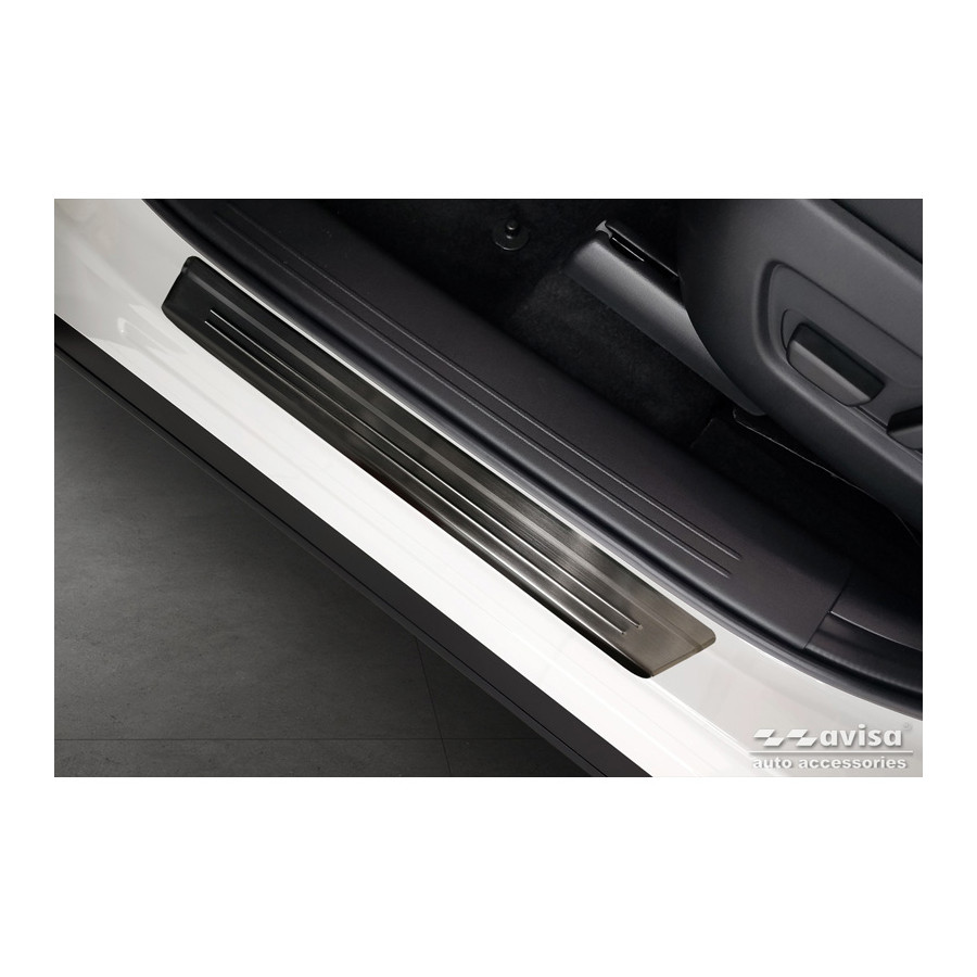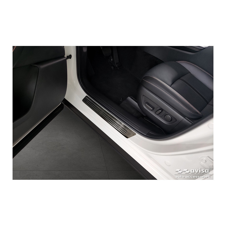 Black Stainless Steel Door Sill Trims suitable for Mazda CX-60 (KH_) 2022- - 'Lines' - Set of 4Door sill trims are the ultimate accessories to protect the sills of your car and give it a luxurious look. These are tailor-made for your type of car, which guarantees a perfect fit. It prevents scratches and damage when getting in and out and protects against the elements. With a wide choice of material and design, you can give your car an individual look. These door sill trims are easy to attach using the supplied 3M tape. Specifications Additional informationStamped linesContents4-piece set for both front and rear doorsColourBlackMaterialStainless steel