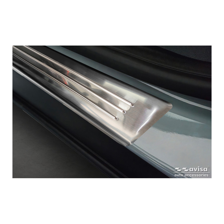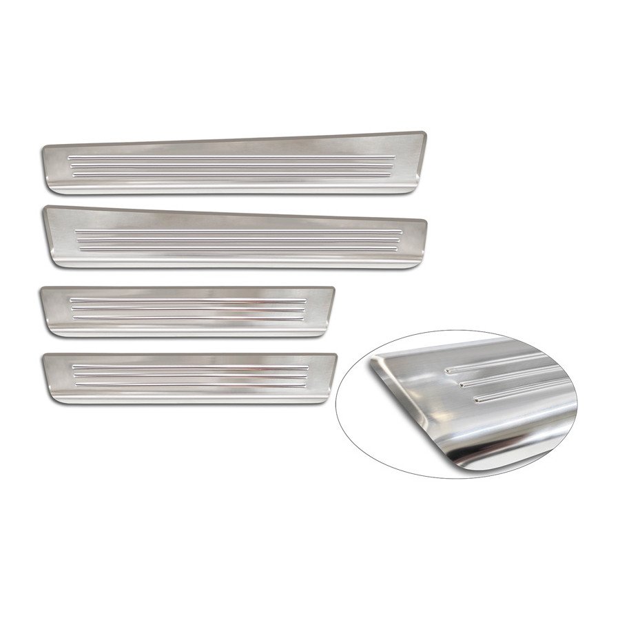 Stainless Steel Door Sill Trims Suitable for Ford Tourneo Courier II 2023- 'Lines' - Set of 4Door sill trims are the ultimate accessories to protect the sills of your car and give them a luxurious look. These are tailor-made for your type of car, which guarantees a perfect fit. It prevents scratches and damage when getting in and out and protects against the elements. With a wide choice of materials and designs, you can give your car an individual look. These door sill trims are easy to attach using the supplied 3M tape. Specifications Additional informationStamped linesContents4-piece set for both front and rear doorsColourSilverMaterialStainless steel