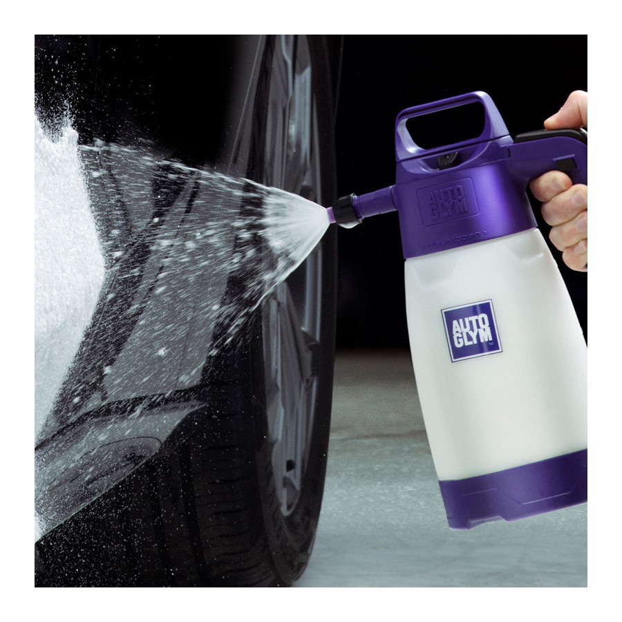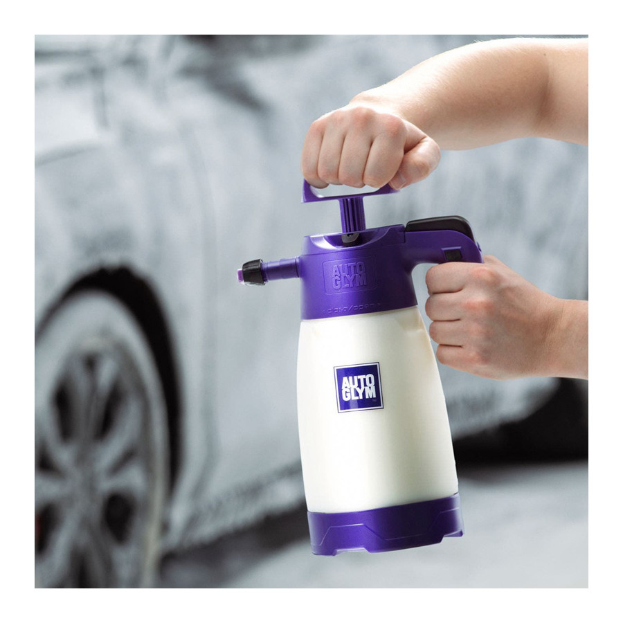 Polar Foam Sprayer. No pressure washer? No problem! This is the alternative way to safely apply a thick layer of snow foam to your car, all without using a pressure washer or foam cannon. The Polar Foam Sprayer offers a pressure-free way to apply foam to your vehicle, wash it, and protect it with Autoglym's wide range of cleaning products. Made from durable materials, this sprayer stands up to heavy use. The Polar Foam Sprayer includes handy features such as a calibrated bottle for precise mixing and a safety valve for easy pressure relief. The Polar Foam Sprayer is ready to use instantly and makes spraying foam easier than ever. Always wear safety glasses when using the sprayer. With the lid screwed on, pull the safety valve to ensure the device is depressurized. Remove the lid and consult the dilution ratio for your chosen product. Fill the bottle to a maximum level of 1.25 liters, screw the lid back on, and pressurize it with a pumping motion until you feel resistance. Always follow the health and safety advice on the product label. Press the trigger to start spraying and use the pump as needed to compensate for any pressure loss. You can lock the trigger action by pressing the black button. Unused product must NOT be left in the bottle after use. Both the sprayer and the bottle should always be rinsed with clean water and then depressurized before storing.