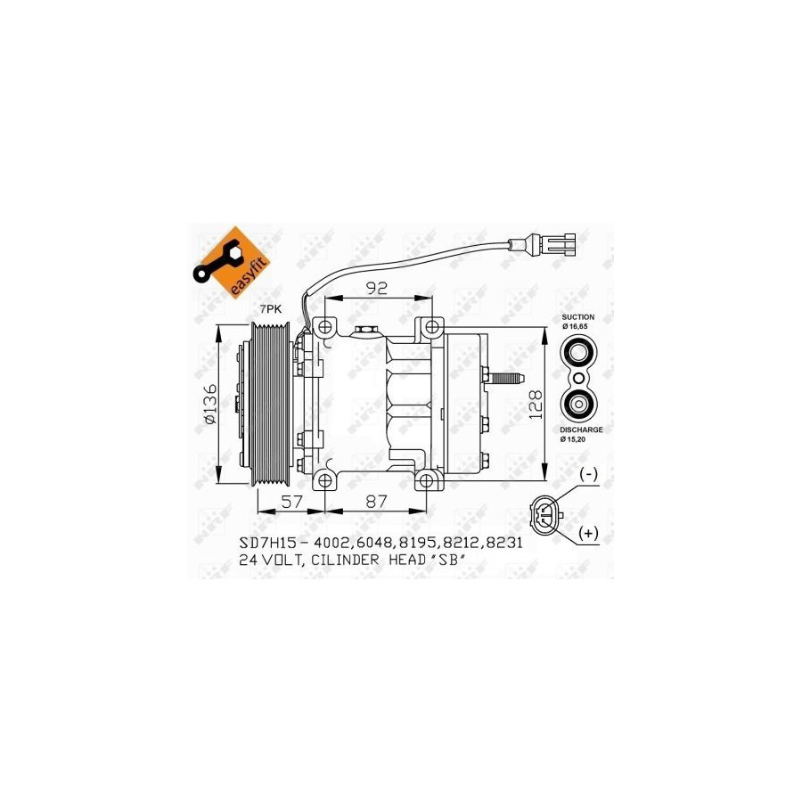 application Air conditioning pump Supplementary Article/Info 2 With PAG compressor oil Voltage [V] 24 Supplementary Article/Supplementary Info With gaskets/seals Manufacturer Restriction SANDEN EQUIVALENT Quality OE EQUIVALENT Belt Pulley Ø [mm] 136 Compressor ID SD7H15 Number of grooves 7 Oil Fill Quantity [ml] 175 Connector Shape Oval Warranty 2 years Compressor oil PAG 46 Cylinder head ID (compressor) SB Exhaust diameter [mm] 16,7 Output diameter [mm] 15,2 Similar products of other manufacturers