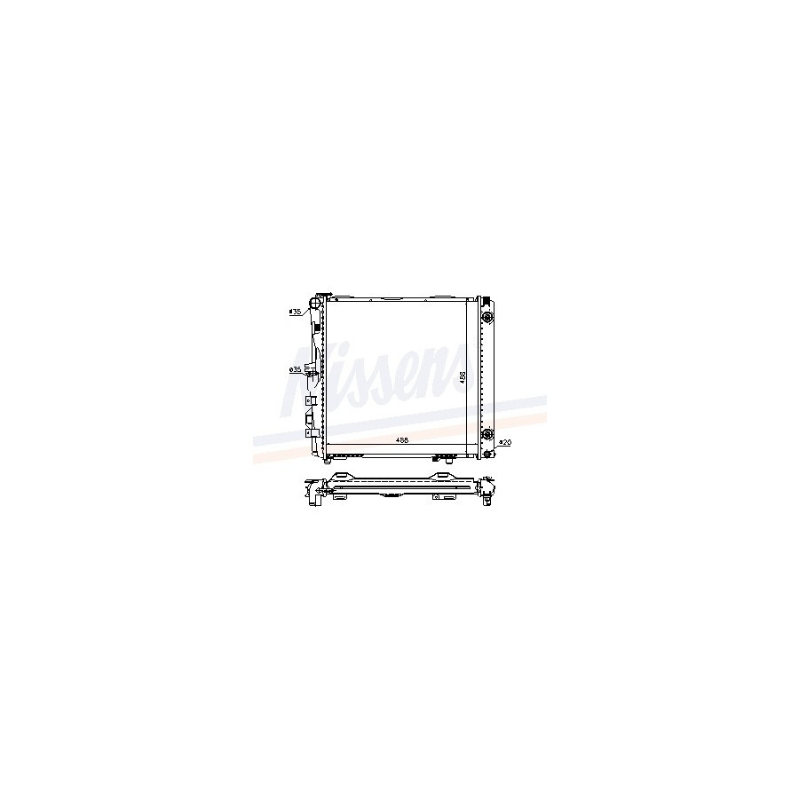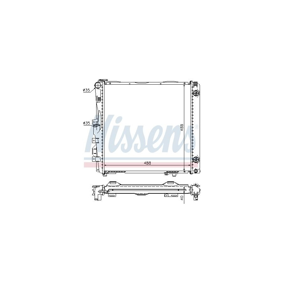 Performance For vehicles without air conditioning Type Radiator Core Length [mm] 488 Core Width [mm] 488 Supplementary Article/Supplementary Info With oil cooler With gaskets/seals Warranty 2 years Radiator type Soldered cooling fins Cooling Fins Material Aluminium Material tank (radiator) Plastic Core Depth [mm] 40 Exhaust diameter [mm] 35 Output diameter [mm] 35 Similar products of other manufacturers