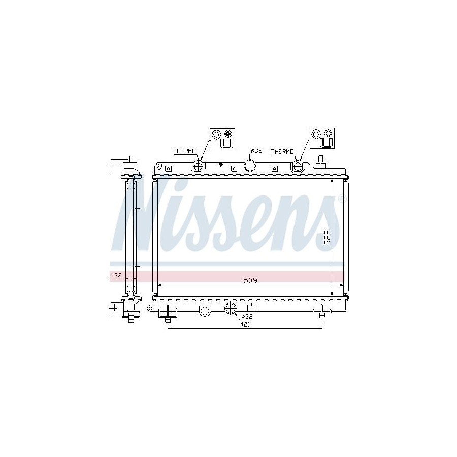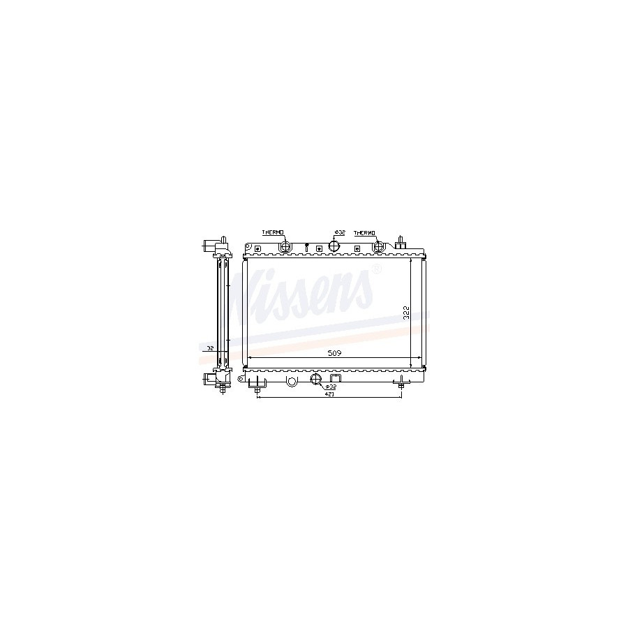 Performance For vehicles without air conditioning Type Radiator Core Length [mm] 322 Core Width [mm] 509 Supplementary Article/Info 2 With thermostat Supplementary Article/Supplementary Info With gaskets/seals Warranty 2 years Radiator type Soldered cooling fins Cooling Fins Material Aluminium Material tank (radiator) Plastic Core Depth [mm] 32 Exhaust diameter [mm] 32 Output diameter [mm] 32 -