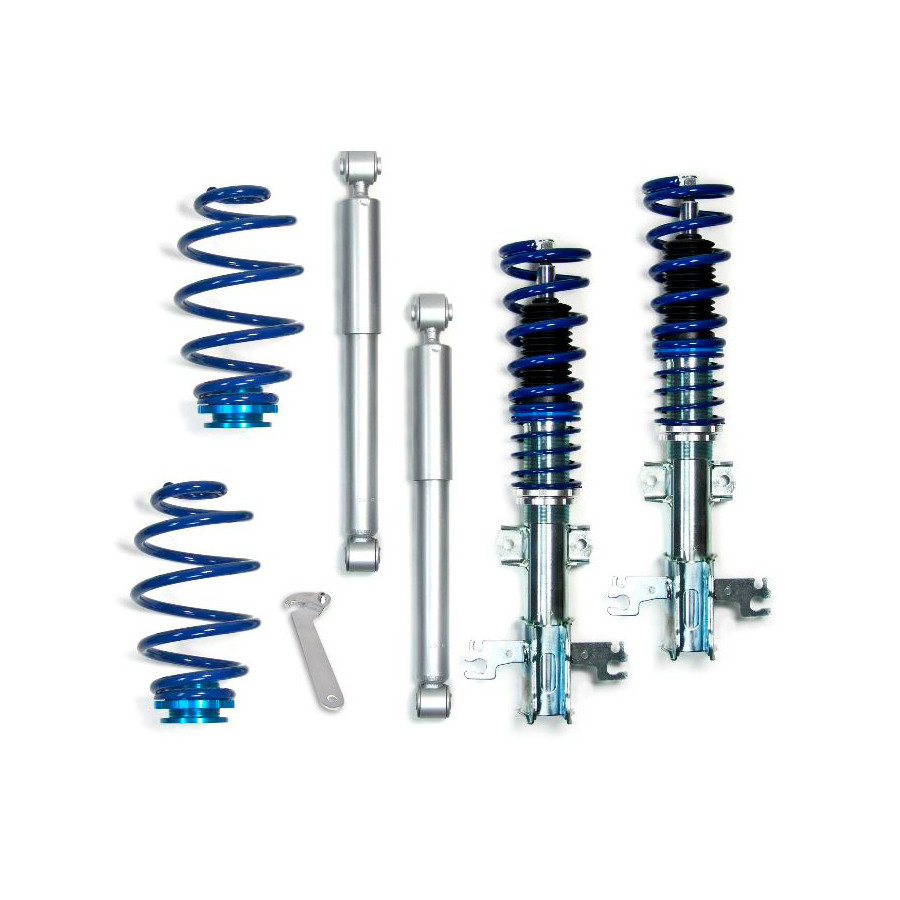 The set is infinitely adjustable in height with the included keys. The shock absorbers are made of galvanized steel and the aluminum dishes. By spraying with a protective oil or spray, the set still remains adjustable after a long time. The screw set has been developed with the best possible price / quality ratio.