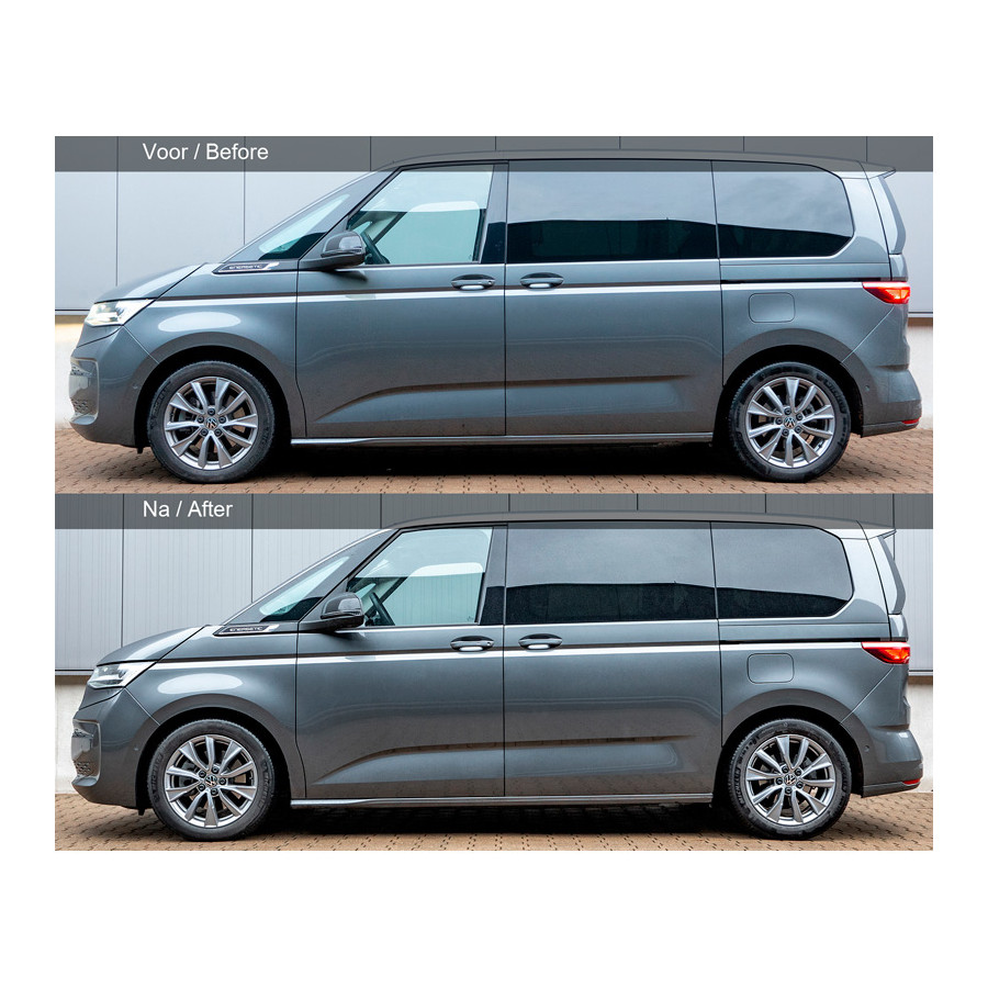 H&R Lowering springs suitable for Volkswagen Multivan T7 (ST) 2.0 TDI (2WD) 2021- VA30/AA35mm (5 & 6 seater)H&R Lowering springs have been developed to provide better handling and a lower ride height while maintaining excellent ride quality. The ideal choice for the enthusiast of racing characteristics on the public road. Sporty lookLowered center of gravityLinear or progressive spring designCan be combined with OEM and aftermarket shock absorbersImproved driveabilitySupplied with ABE or TÜV certificateDesigned, produced and tested in GermanyPowder coated for improved looks and corrosion resistanceApplicable to:Volkswagen Multivan T7 ST, 2.0 TDI 2WD 2021-, 5 & 6- seater, incl. Edition/Life/Style, excl. Adaptive/Sport chassis, excl. PHEV, Front axle 30mm/Rear axle 35mm Attention Belgian customers! The Goca certificate for Belgium is not included as standard. You can request this via your Autostyle dealer. The price for the certificate is €30,-
