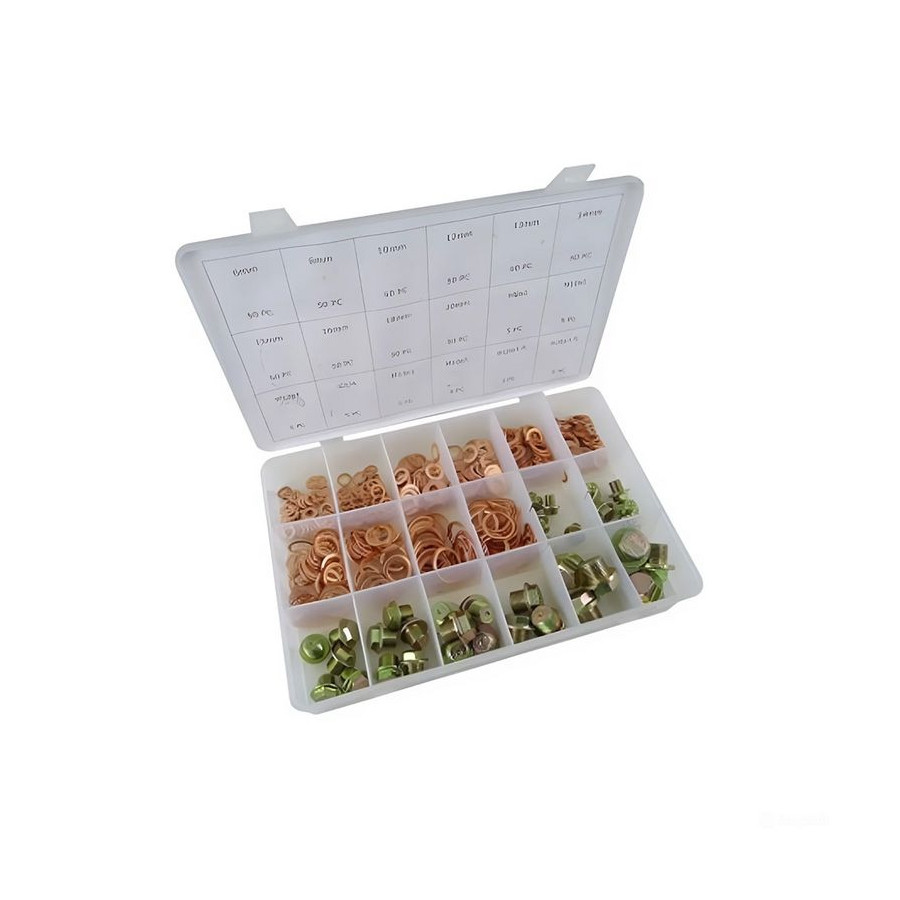 Large assortment of the most common crankcase plugs and copper rings from M10 to M20.