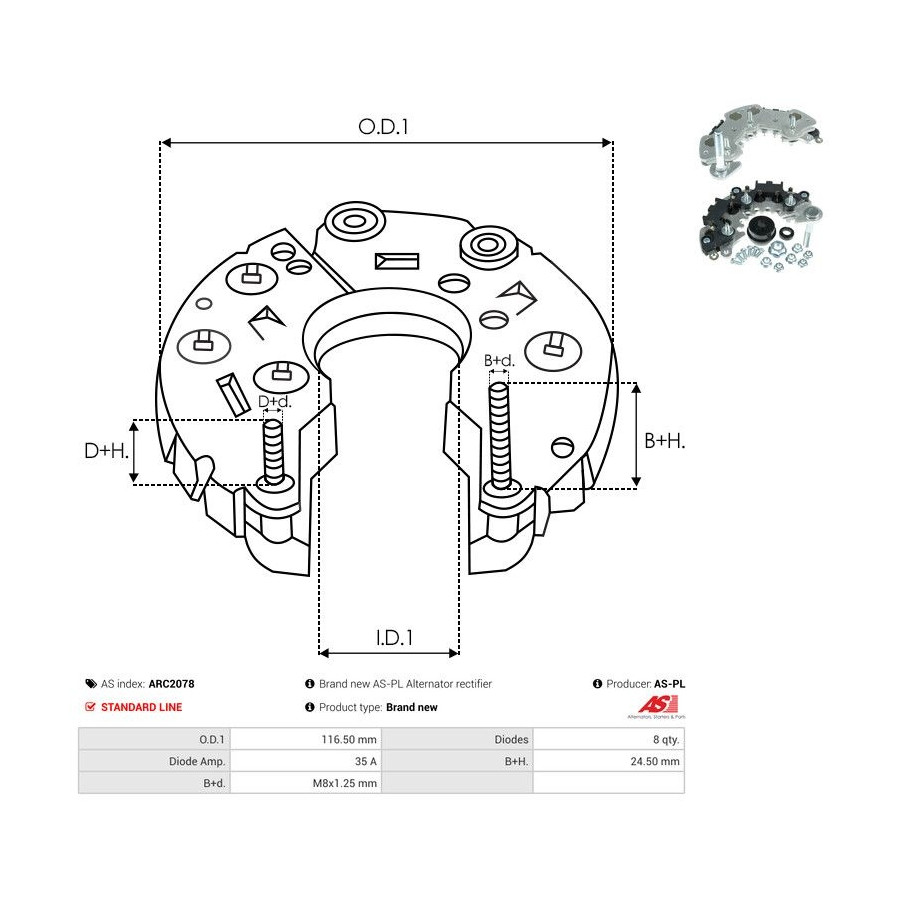 Outer diameter [mm] 116,50 Quality Standard line Warranty 2 years Number of diodes 8 Current [A] 35 New part without deposit -