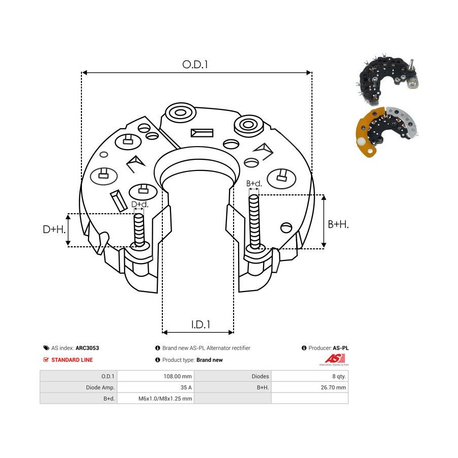 Outer diameter [mm] 108,00 Quality Standard line Warranty 2 years Number of diodes 8 Current [A] 35 New part without deposit -