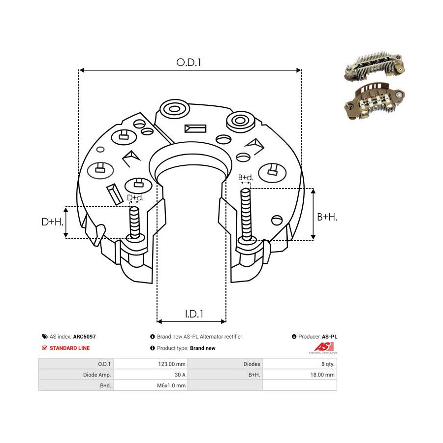 Outer diameter [mm] 123,00 Quality Standard line Warranty 2 years Number of diodes 8 Current [A] 30 New part without deposit Similar products of other manufacturers