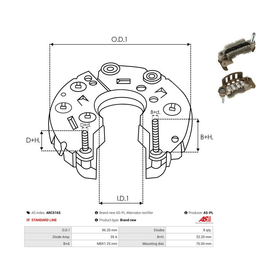 Outer diameter [mm] 96,20 Quality Standard line Warranty 2 years Number of diodes 8 Current [A] 35 New part without deposit -