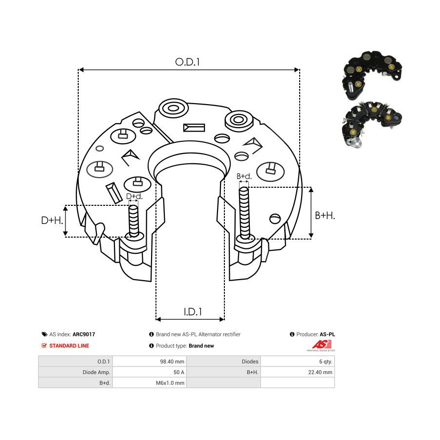 Outer diameter [mm] 98,40 Quality Standard line Warranty 2 years Number of diodes 6 Current [A] 50 New part without deposit -