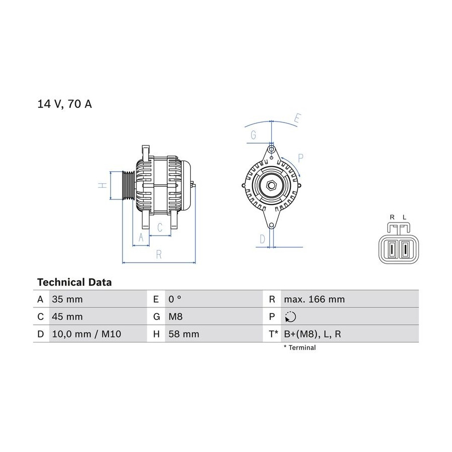 Voltage [V] 14 Alternator Charge Current [A] 70 Belt Pulley Ø [mm] 58 Number of grooves 5 Pulleys With multi-belt pulley Distance from pulley to alternator [mm] 35 Rotation Direction Clockwise rotation Clamp B+(M8),L,R Plug Type ID PL89 Alternator type Excl. vacuum pump Recommended additional repairs V-Belt/V-Ribbed Belt Warranty 2 years Method of attachment Double Pivot Lever Length [mm] 166 Refurbished item Similar products of other manufacturers