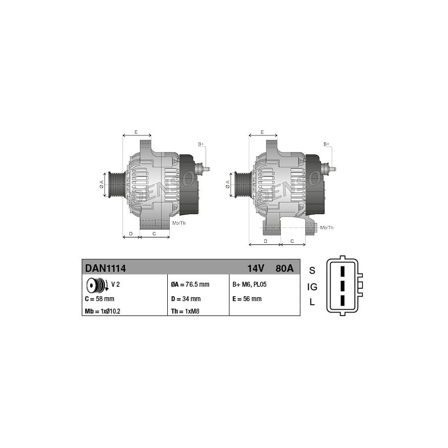 Voltage [V] 14 Number of Ribs 2 Alternator Charge Current [A] 80 Belt Pulley Ø [mm] 77 Pulleys With belt pulley Quality Denso Vehicle Main Current For vehicles with 12V main current Warranty 2 years Gross weight [g] 5770 New part without deposit Similar products of other manufacturers