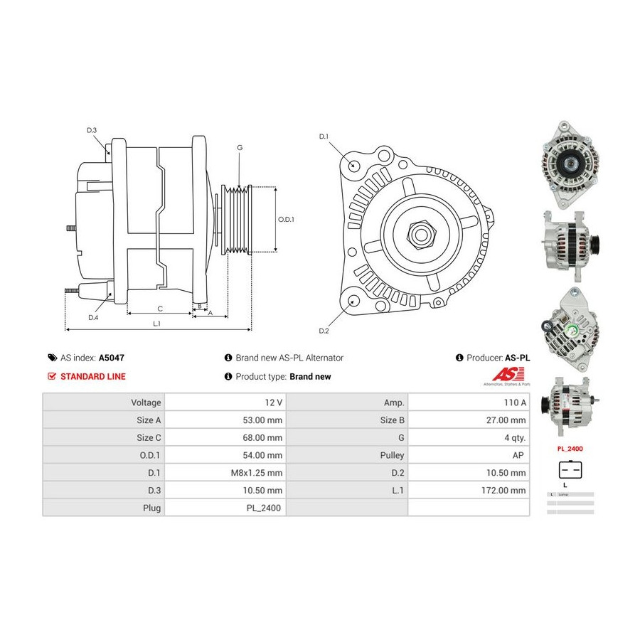 Voltage [V] 12 Alternator Charge Current [A] 110 Pulleys With belt pulley for OE number A2TC0391 Quality Standard line Warranty 2 years New part without deposit Similar products of other manufacturers
