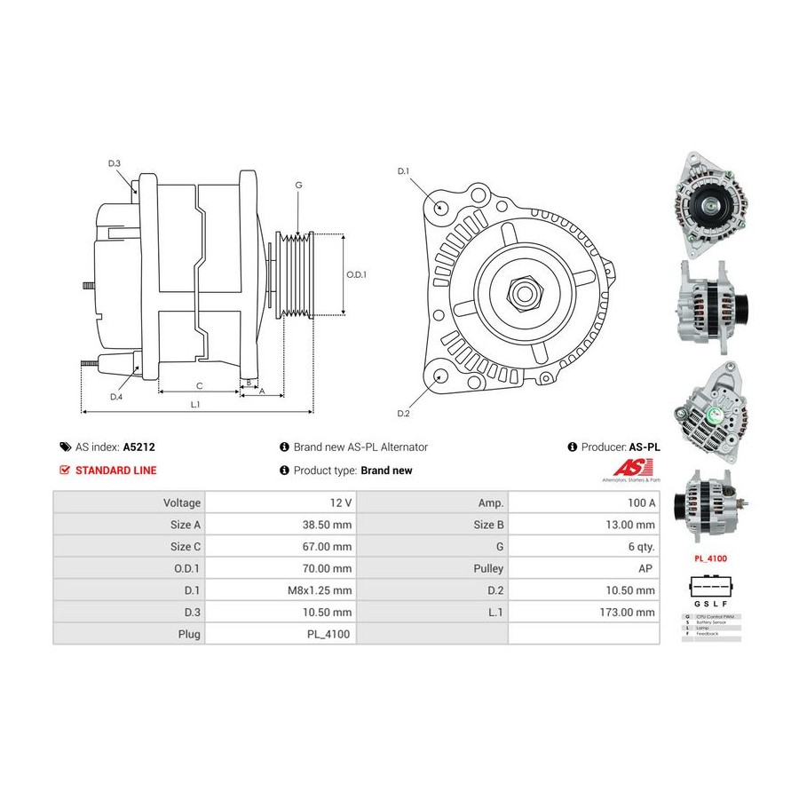 Voltage [V] 12 Alternator Charge Current [A] 100 Pulleys With belt pulley Quality Standard line Warranty 2 years New part without deposit Similar products of other manufacturers