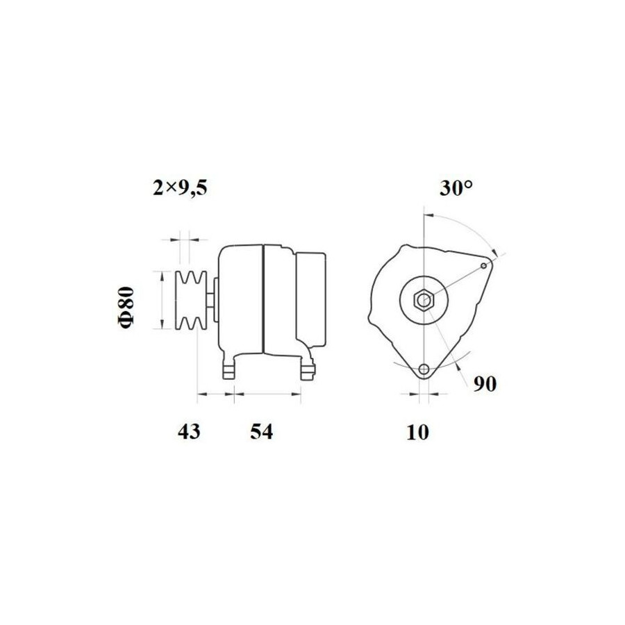Voltage [V] 14 Alternator Charge Current [A] 70 Belt Pulley Ø [mm] 80 Pulleys With double pulley Mounting points diameter [mm] 90,0 Mounting bores distance [mm] 54 Distance from pulley to alternator [mm] 43,0 Bore Ø [mm] 10 Number of belts 2 Rotation Direction Clockwise rotation Packaging length [cm] 24,8 Packaging width [cm] 18,60 Packaging height [cm] 17,50 Warranty 2 years Connecting Angle [Degree] 30,0 Net Weight [g] 7032 Similar products of other manufacturers