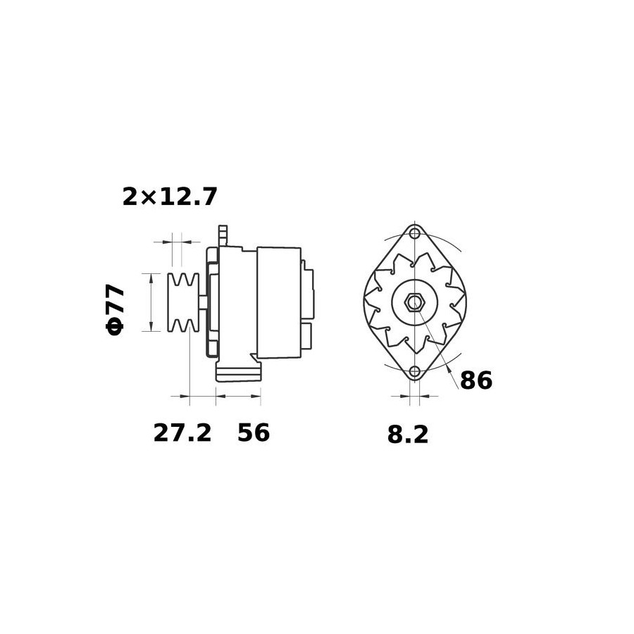 Voltage [V] 14 Number of Ribs 2 Alternator Charge Current [A] 75 Belt Pulley Ø [mm] 77 Pulleys With double pulley Mounting points diameter [mm] 86,0 Mounting bores distance [mm] 56,0 Number of mounting bores 1 Connector / Clamp W Distance from pulley to alternator [mm] 27,2 Number of belts 2 Rotation Direction Clockwise rotation Packaging length [cm] 24,8 Packaging width [cm] 18,60 Packaging height [cm] 17,50 Warranty 2 years Dust Cover With dust cover Connecting Angle [Degree] 0.0 Net Weight [g] 5222 Hole diameter [mm] 8,2 Similar products of other manufacturers
