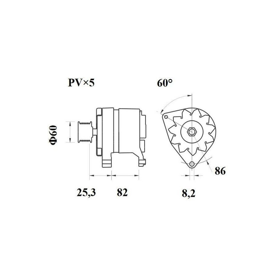 Voltage [V] 14 Number of Ribs 5 Alternator Charge Current [A] 55 Belt Pulley Ø [mm] 60 Pulleys With v-ribbed belt pulley Mounting points diameter [mm] 86,0 Mounting bores distance [mm] 82,0 Connector / Clamp W Distance from pulley to alternator [mm] 25,3 Rotation Direction Clockwise rotation Packaging length [cm] 24,8 Packaging width [cm] 18,60 Packaging height [cm] 17,50 Warranty 2 years Net Weight [g] 4830 Hole diameter [mm] 8,2 Similar products of other manufacturers
