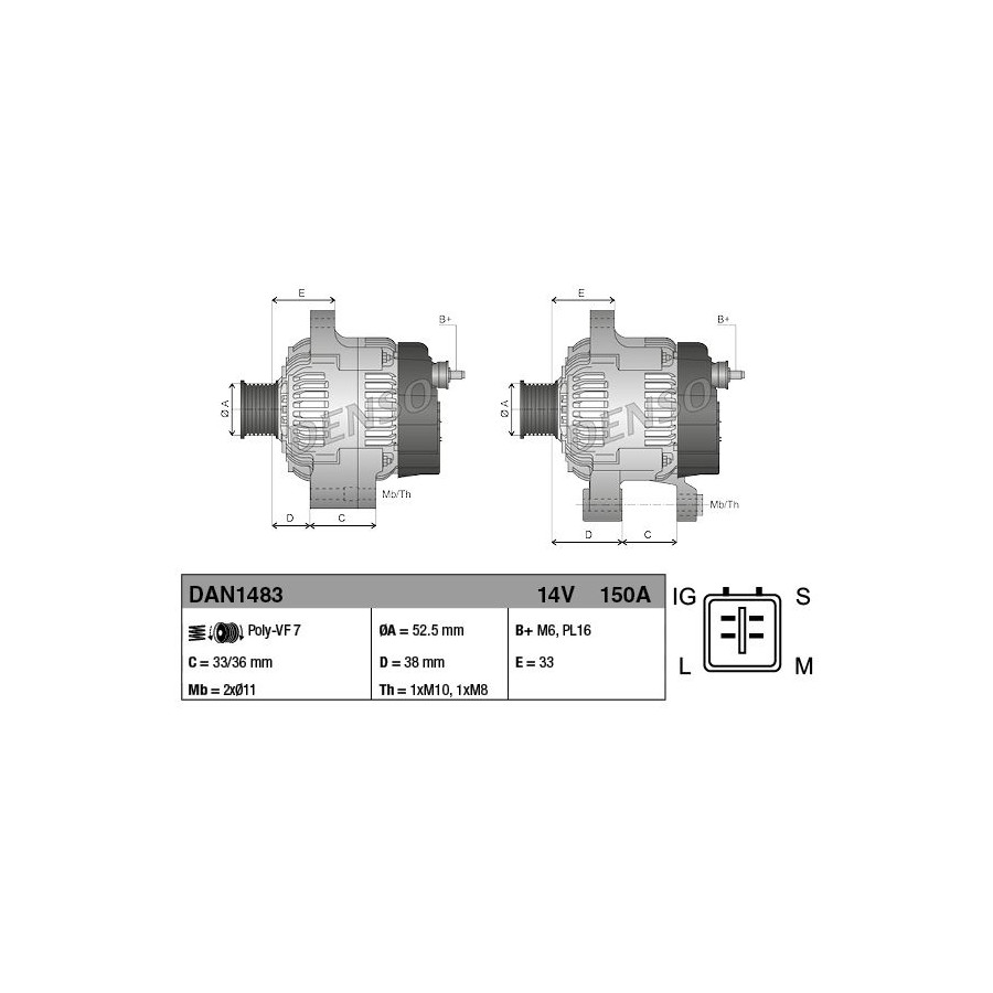 Voltage [V] 14 Number of Ribs 7 Alternator Charge Current [A] 150 Belt Pulley Ø [mm] 53 Pulleys With freewheel belt pulley Quality Denso Vehicle Main Current For vehicles with 12V main current Warranty 2 years Gross weight [g] 6250 New part without deposit Similar products of other manufacturers