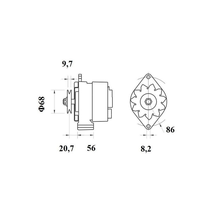 Voltage [V] 14 Number of Ribs 1 Alternator Charge Current [A] 65 Belt Pulley Ø [mm] 68 Pulleys With belt pulley Mounting points diameter [mm] 86,0 Mounting bores distance [mm] 56,0 Distance from pulley to alternator [mm] 20,7 Number of belts 1 Rotation Direction Clockwise rotation Packaging length [cm] 24,8 Packaging width [cm] 18,60 Packaging height [cm] 17,50 Warranty 2 years Net Weight [g] 4702 Hole diameter [mm] 8,2 Similar products of other manufacturers