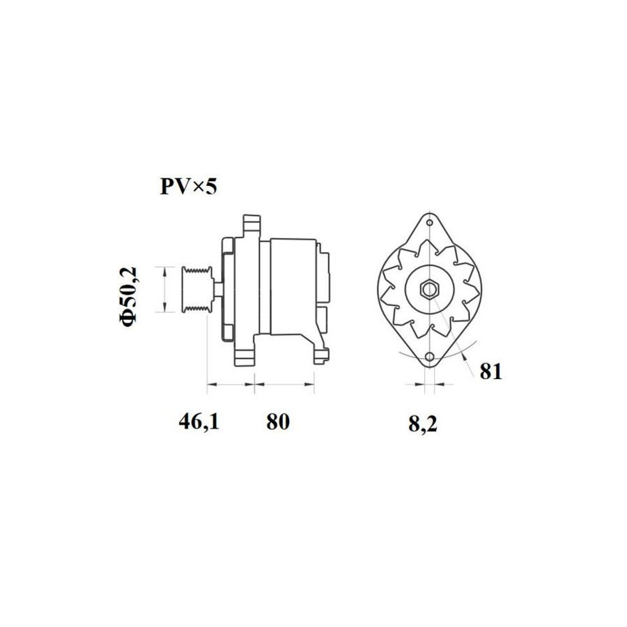 Voltage [V] 14 Alternator Charge Current [A] 70 Belt Pulley Ø [mm] 50 Pulleys With v-ribbed belt pulley Mounting points diameter [mm] 81,0 Mounting bores distance [mm] 80,0 Distance from pulley to alternator [mm] 46,1 Bore Ø [mm] 8,2 Number of belts 5 Rotation Direction Clockwise rotation Packaging length [cm] 24,8 Packaging width [cm] 18,60 Packaging height [cm] 17,50 Warranty 2 years Net Weight [g] 4700 Similar products of other manufacturers